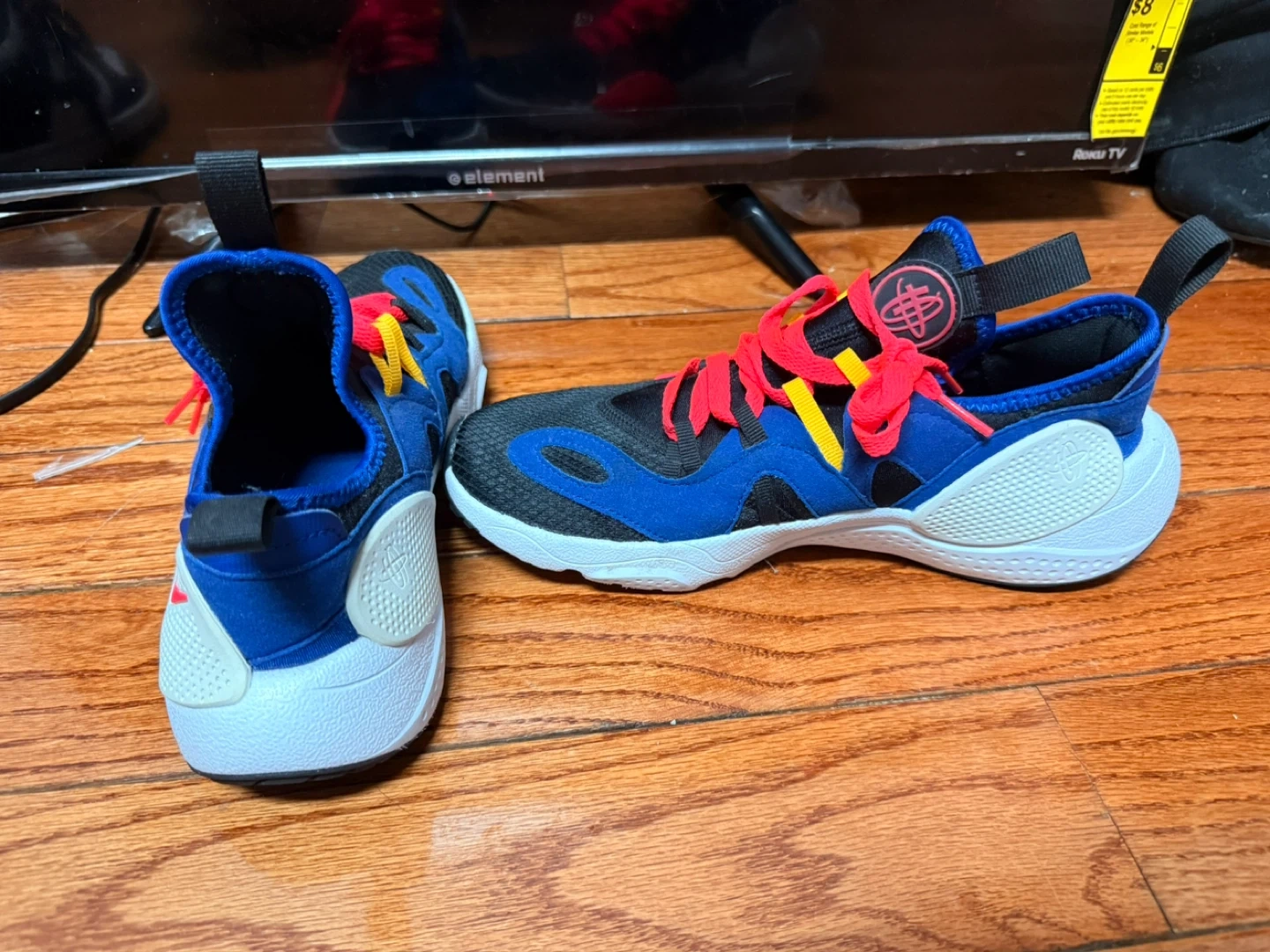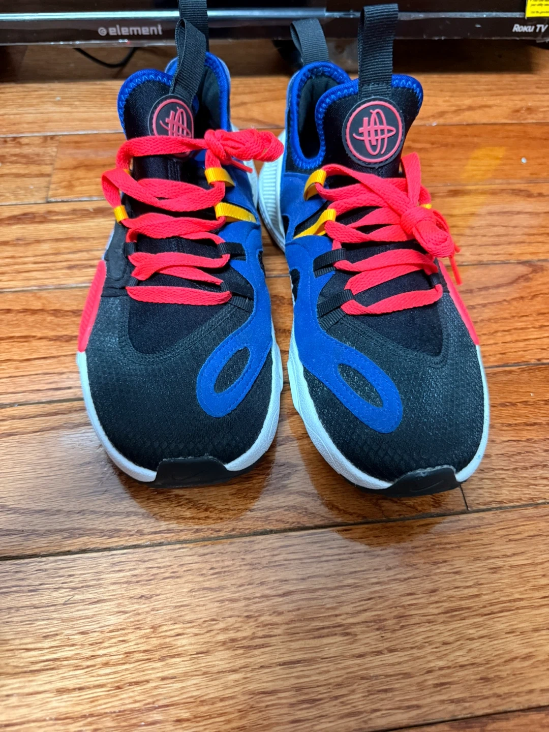 These Nike Huarache running shoes come in a blue, black, and red colorway. They're designed for comfort and performance. Featuring a dynamic lacing system and a supportive heel counter.
