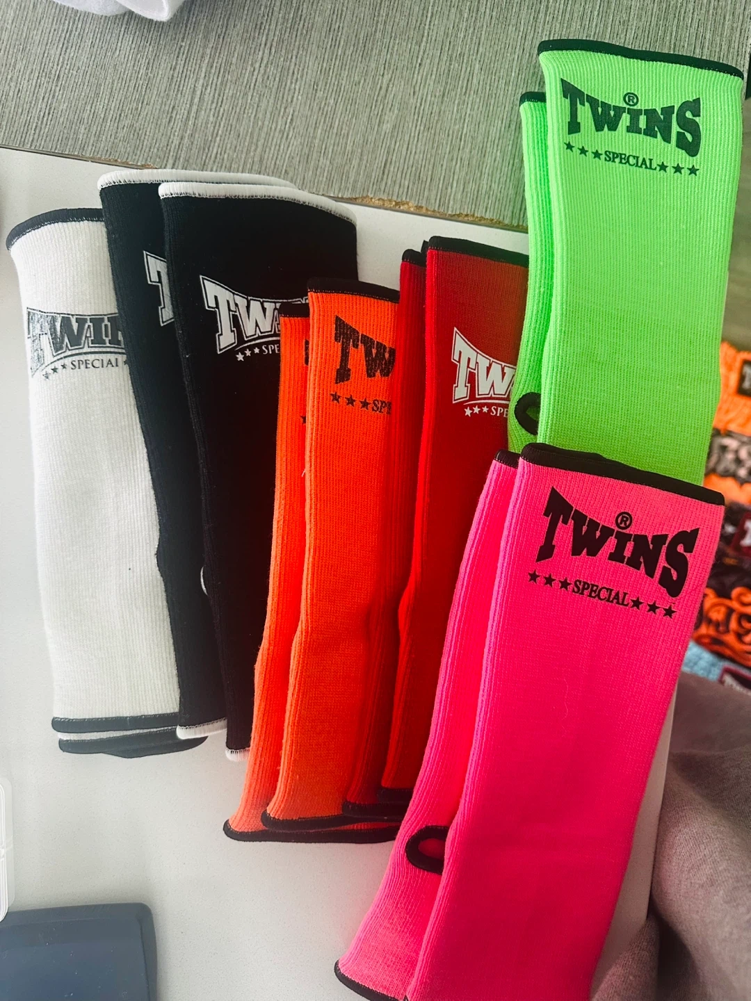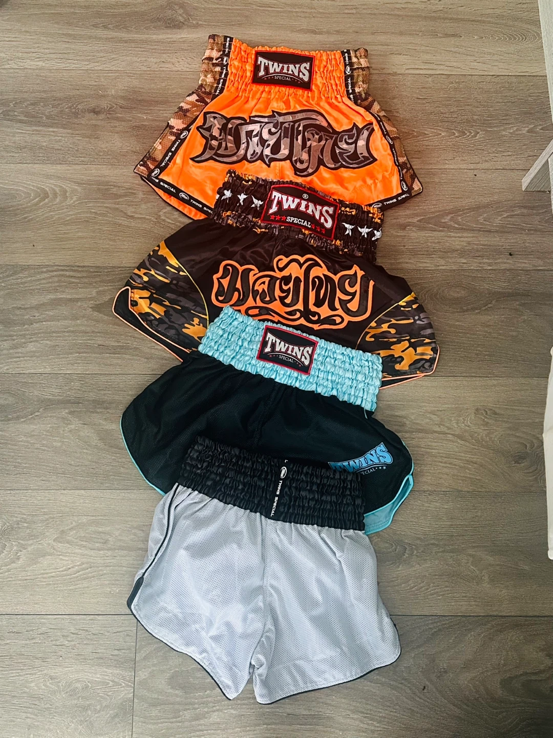This lot includes various TWINS Special Muay Thai shorts and shin guards/socks in different colours. All straight from Thailand.