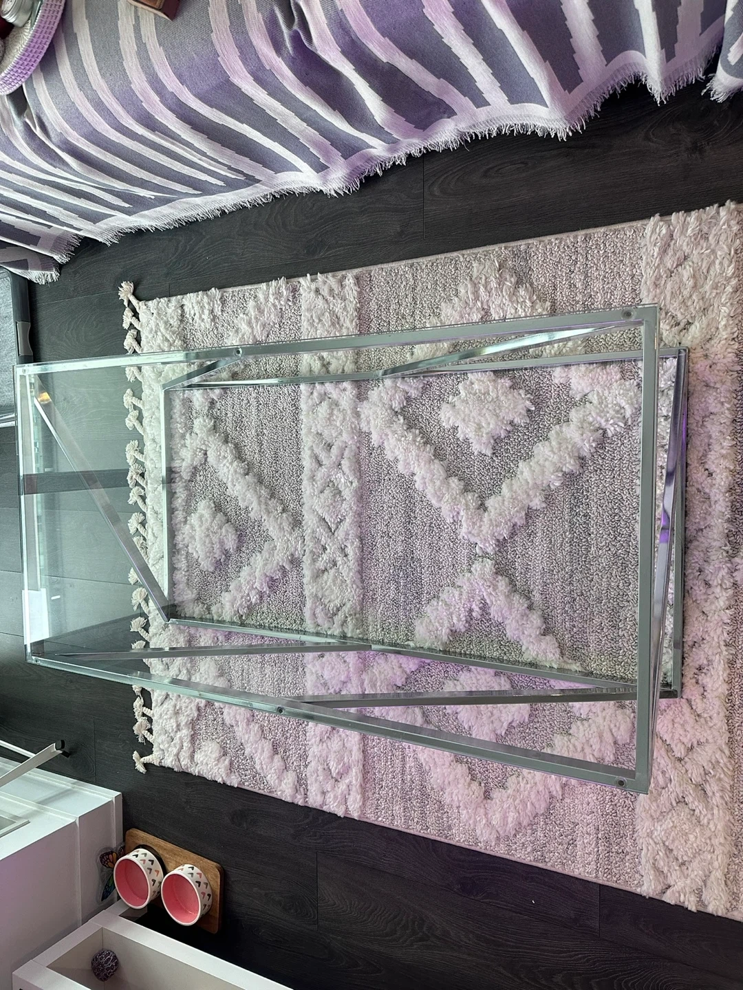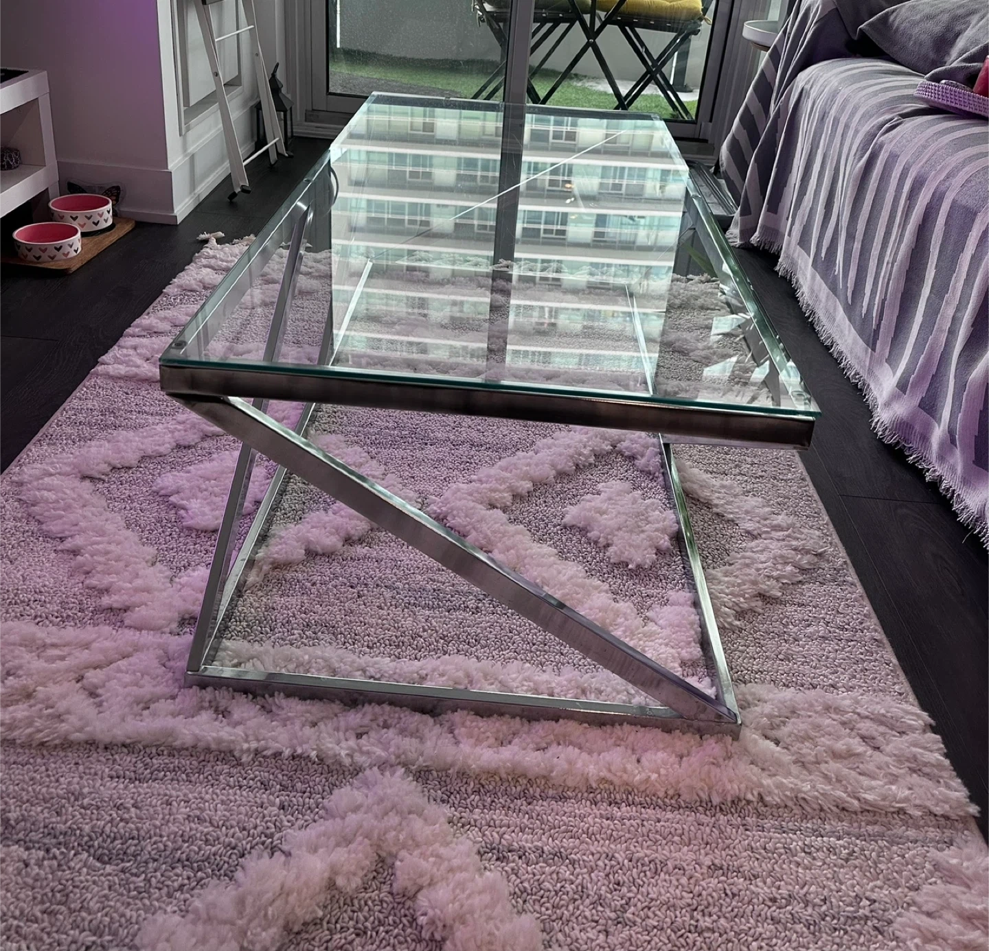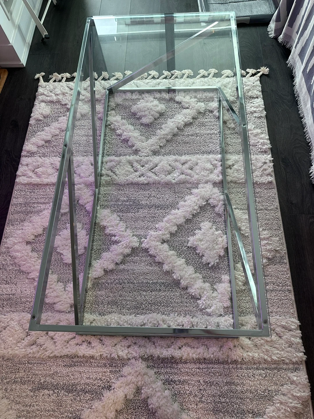 A modern coffee table with a sleek glass top and a geometric chrome metal frame. It's a stylish piece for any living room. The spacious surface is great for holding drinks and decor.