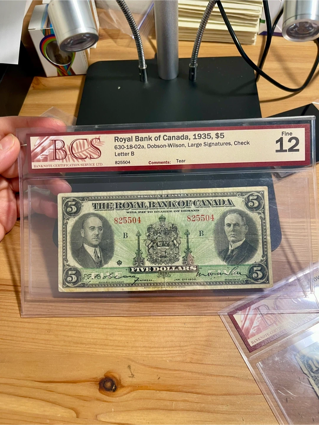 This is a 1935 five-dollar banknote from The Royal Bank of Canada. It's from the Dobson-Wilson series with large signatures and a check letter B. The note has a grade of Fine 12 with comments indicating a tear.