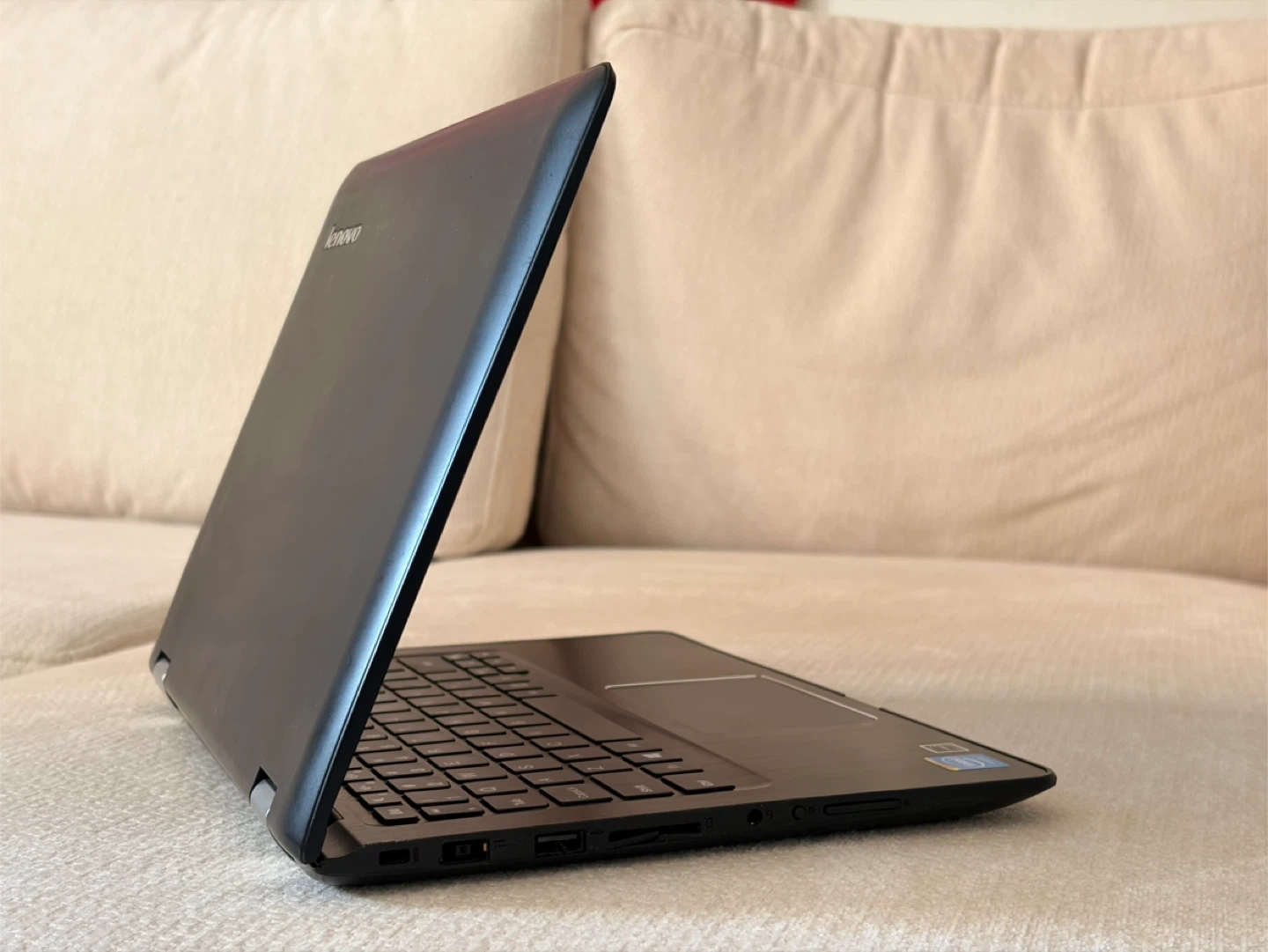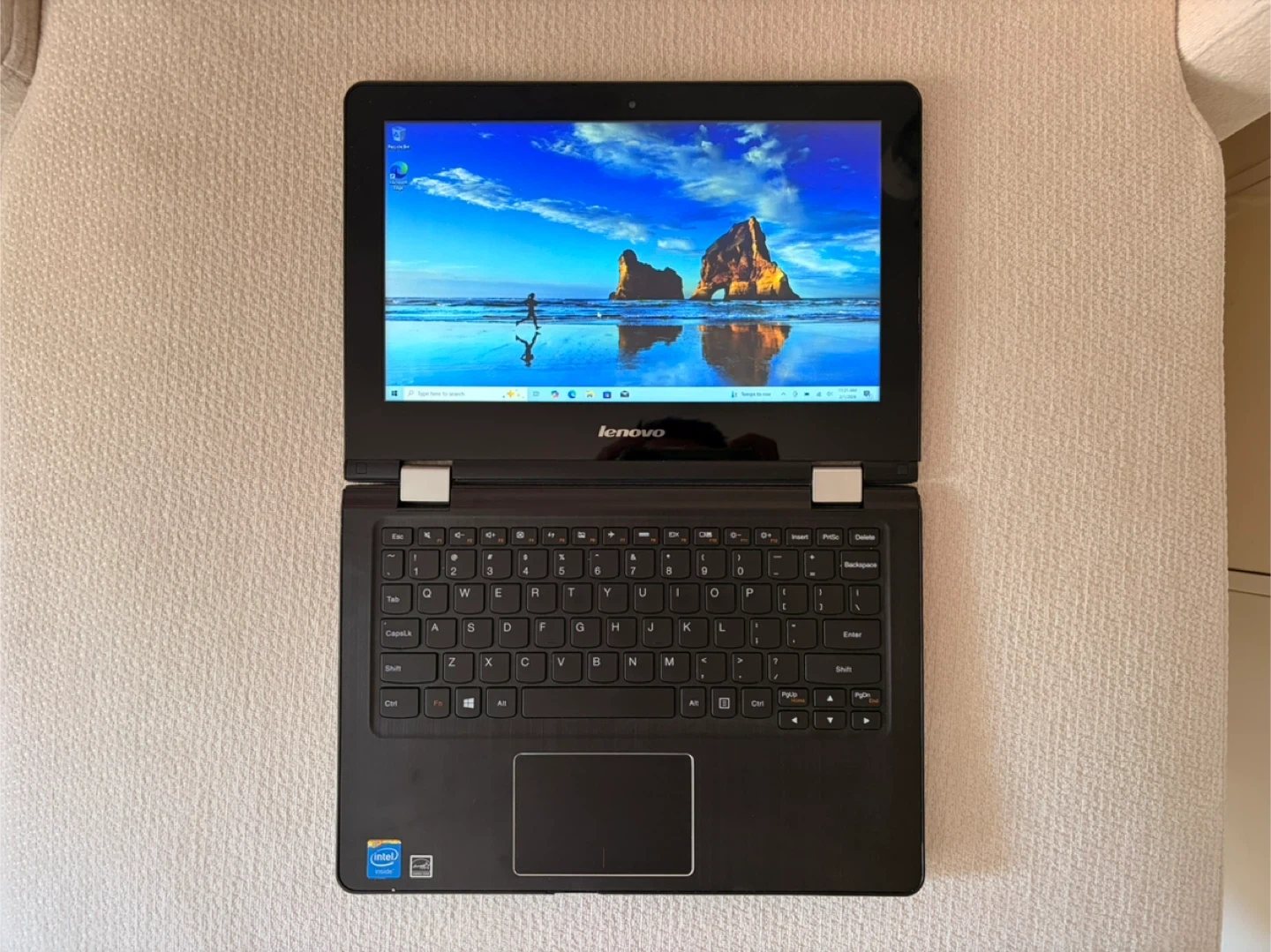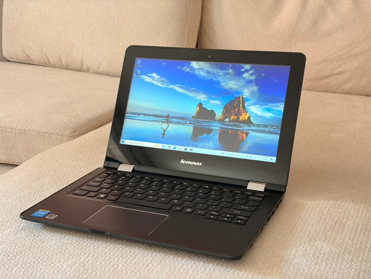 This is a Lenovo laptop. It has a black finish and a standard keyboard layout. It's a versatile device suitable for everyday computing tasks. You can use it like laptop and tablet. Perfect for office tasks, remote work, school, and media. • Intel Celeron N3060 (up to 2.5Ghz, 2 Cores) • 4GB RAM / 500GB Storage • 11.6” LED Touchscreen Charger included Battery life: about 3-4h