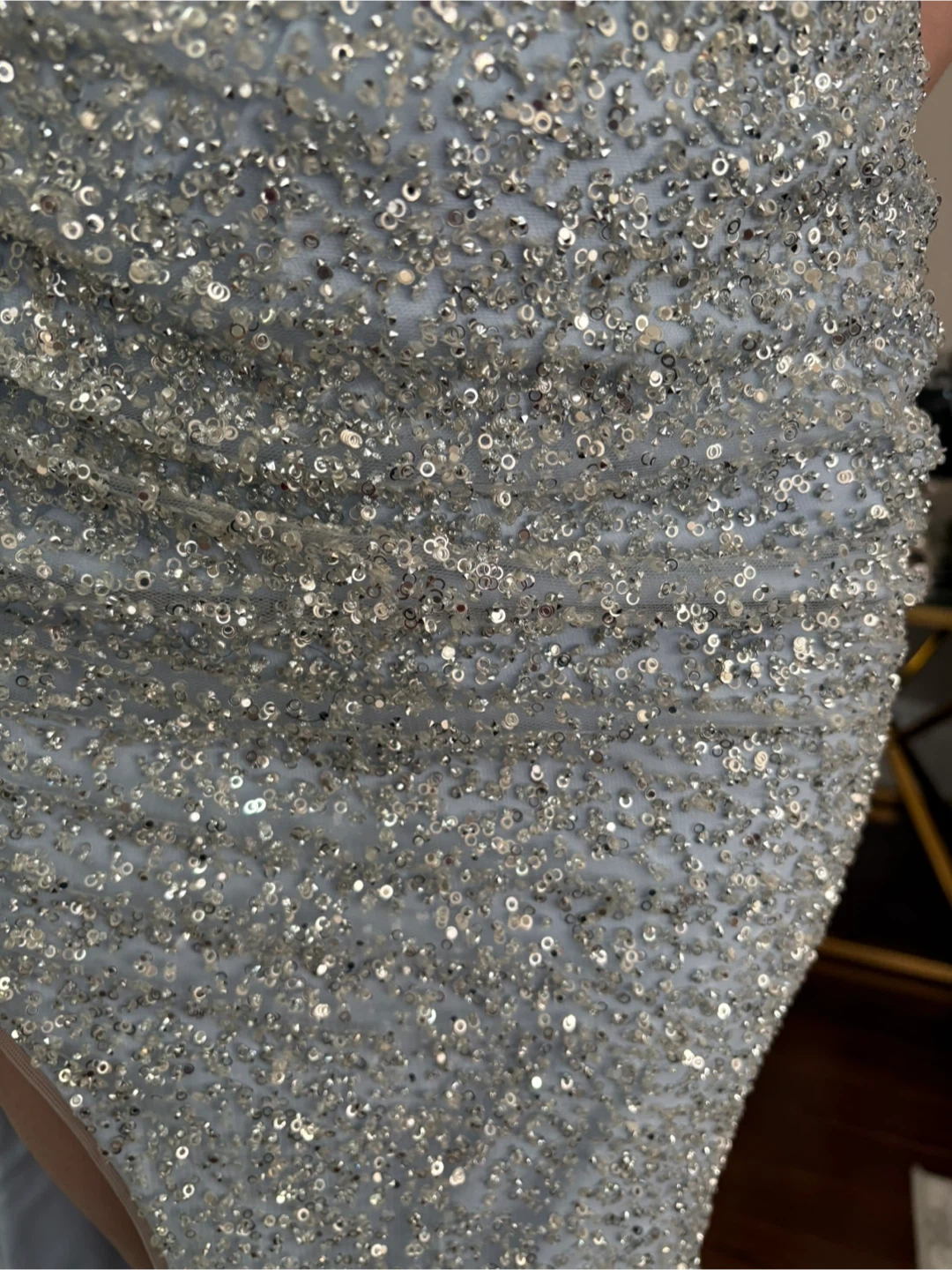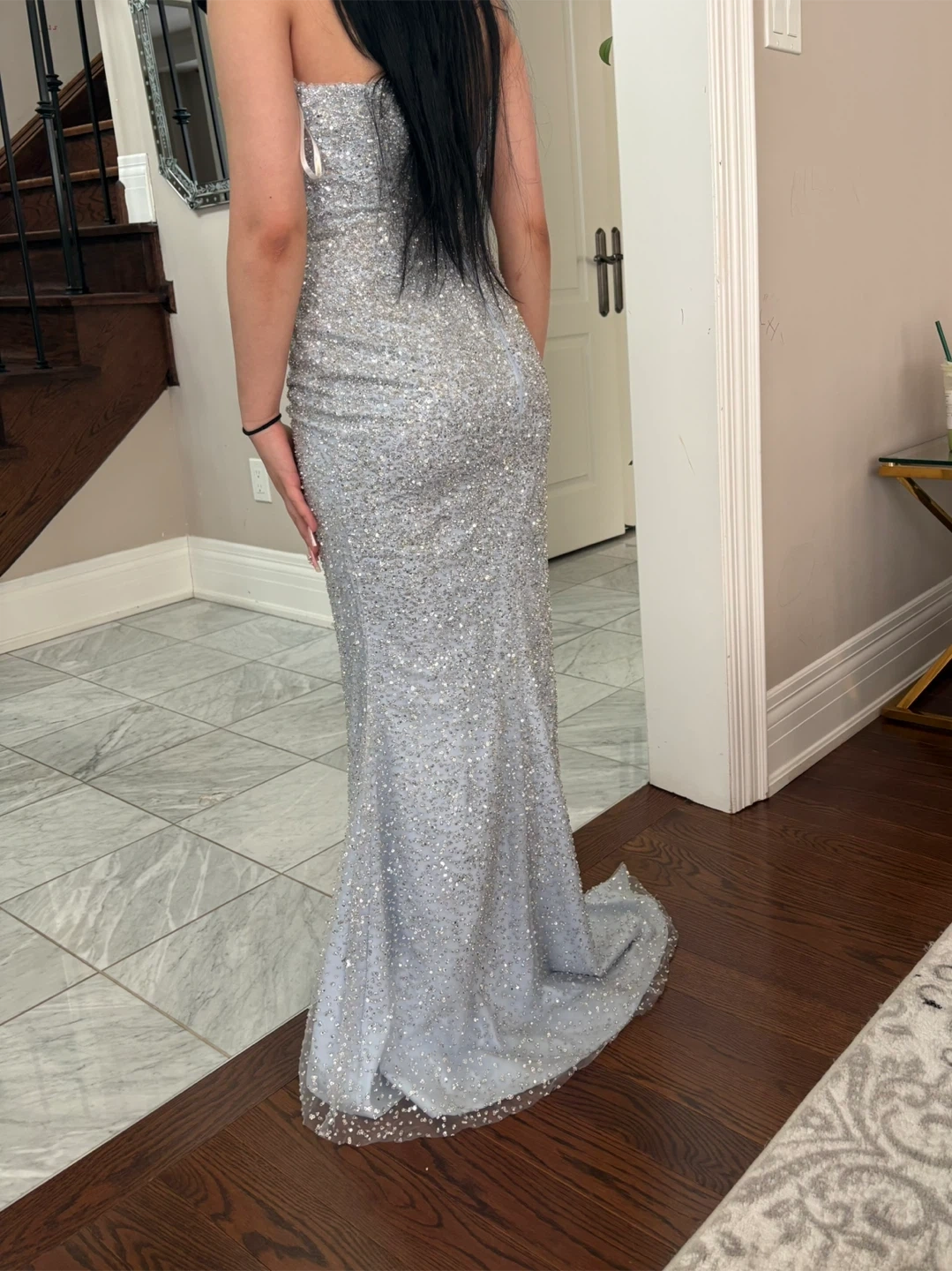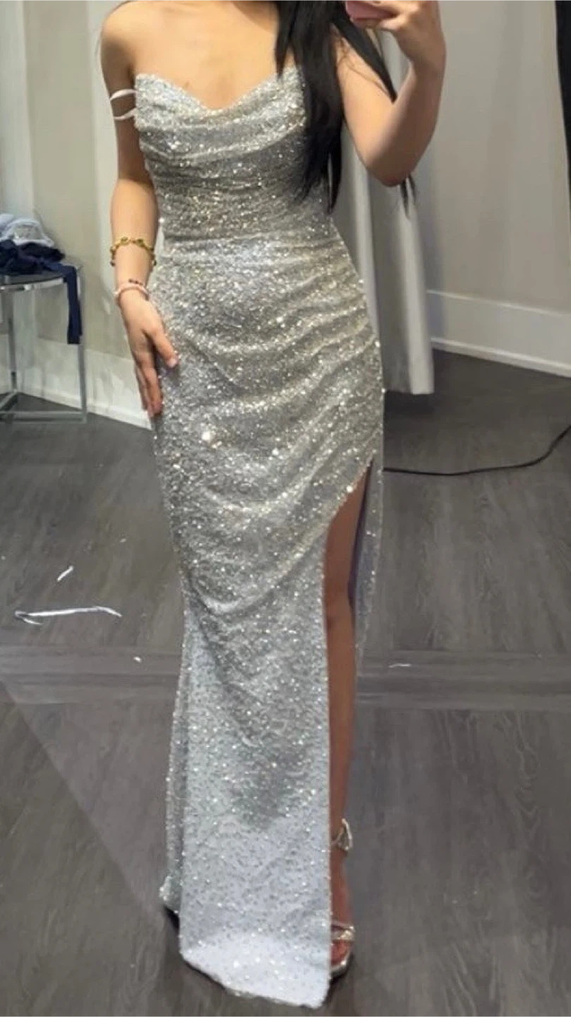 Sparkly sequin strapless gown with a high slit. It features intricate all-over sequin embellishments and a fit. Perfect for a formal event or a night out!