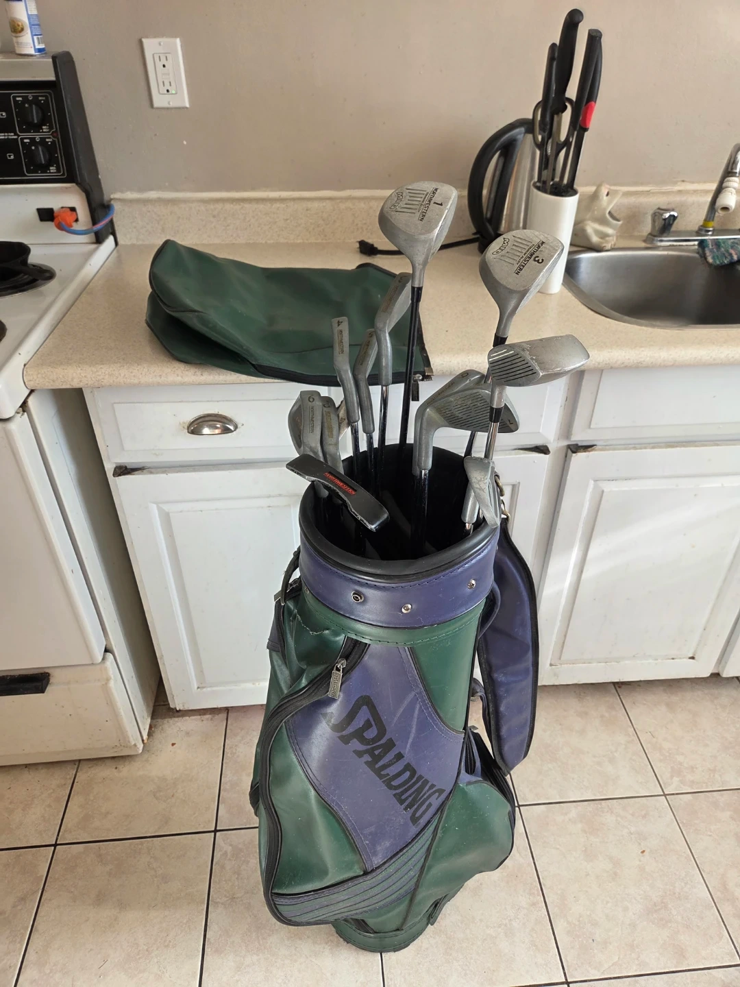 Selling old set of right hand Northwestern. 1,3,5 drivers & 3-9 irons, sand and pitching wedges, putter, 4 more driving irons and a crappy bag with balls and tees hidden inside.