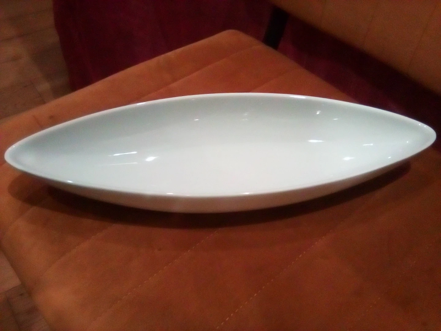 This is a white porcelain oval serving dish from Maison Blanc. It's microwave and dishwasher safe. Made in China.