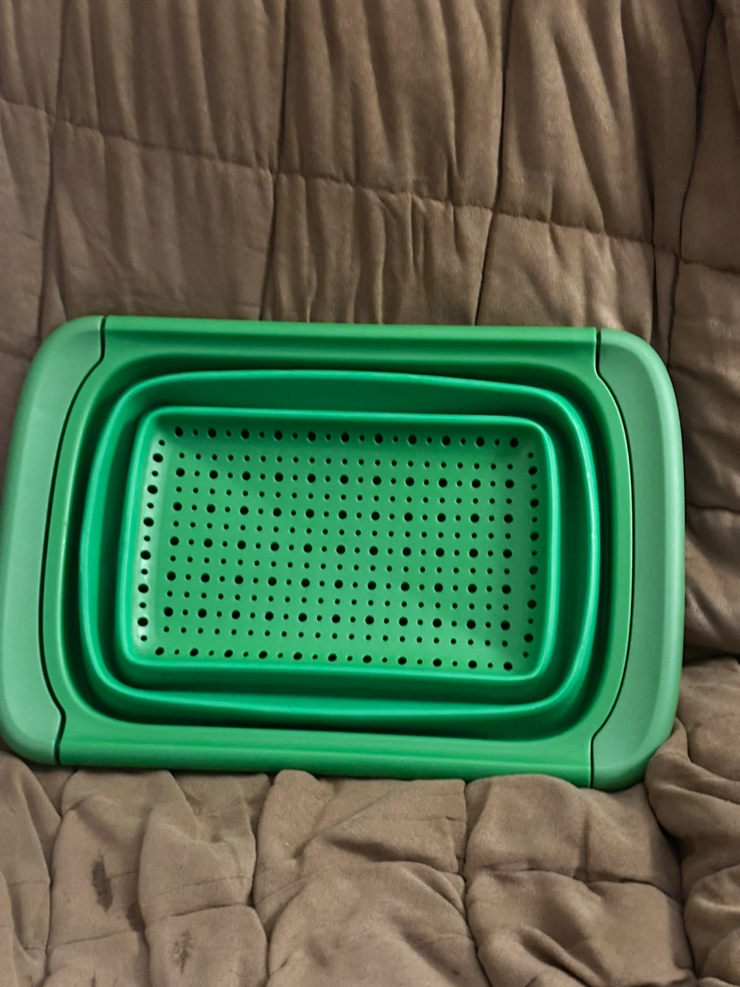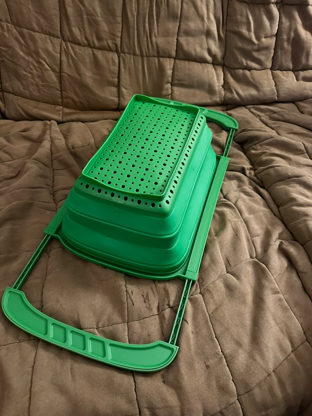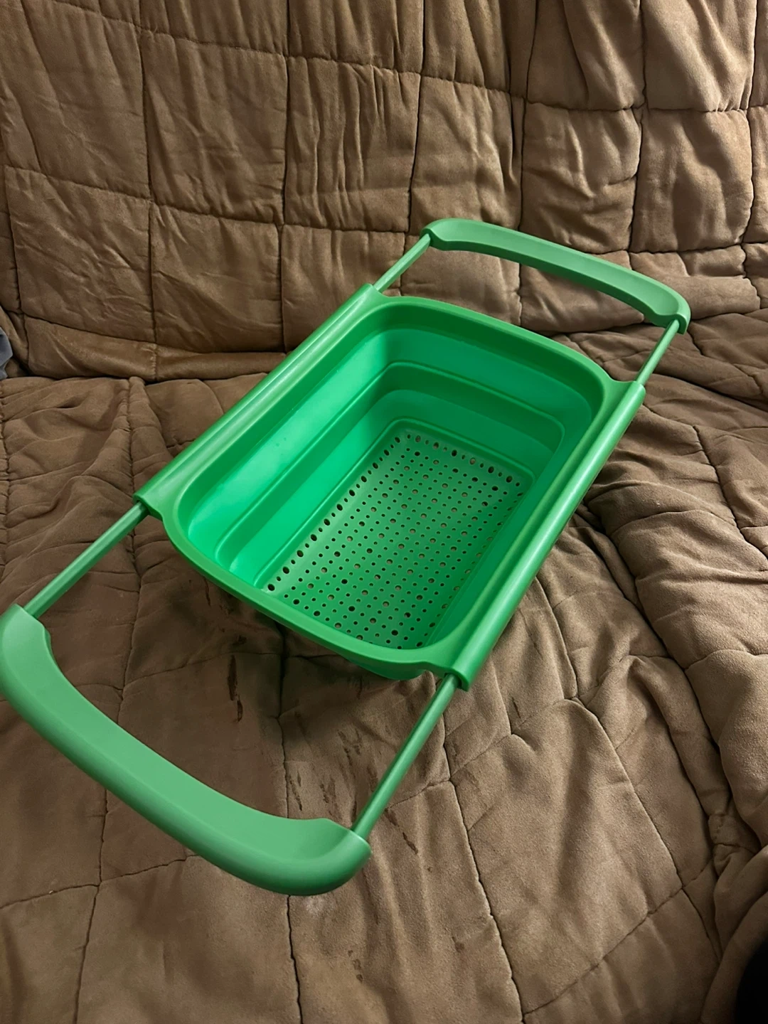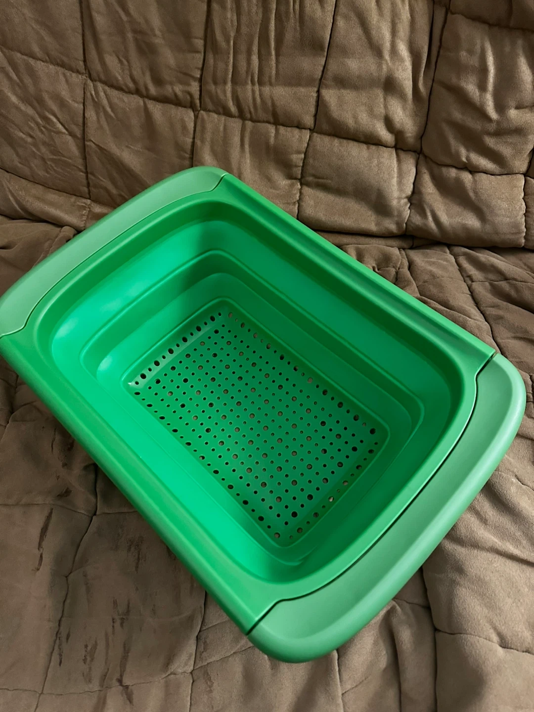 This green colander is designed to be collapsible for easy storage. It's made of plastic and features a perforated basket for draining. It's perfect for washing fruits and vegetables.