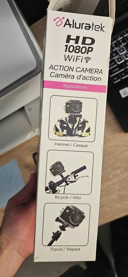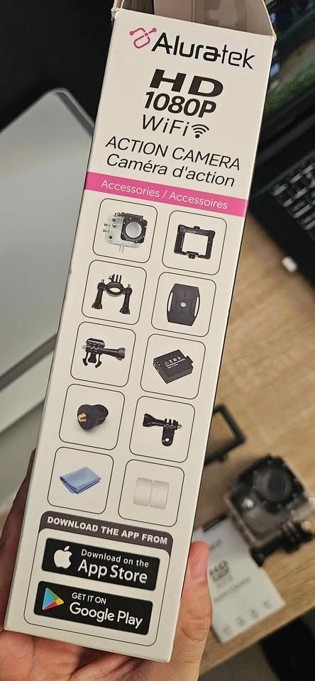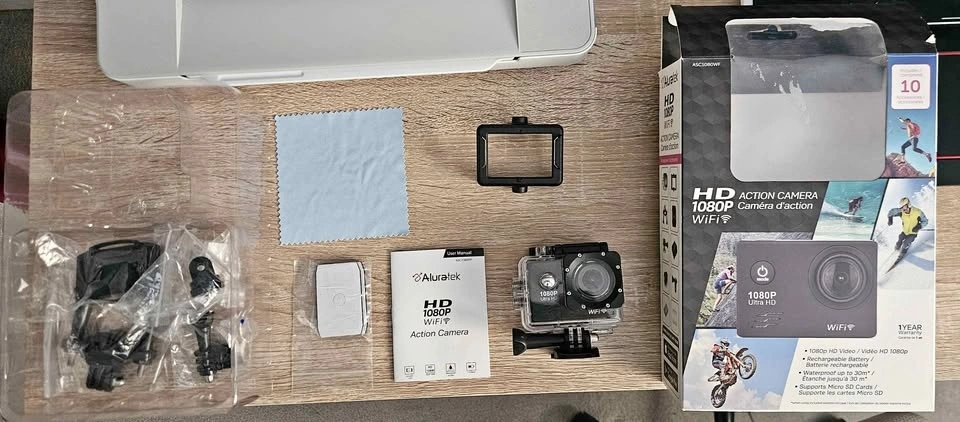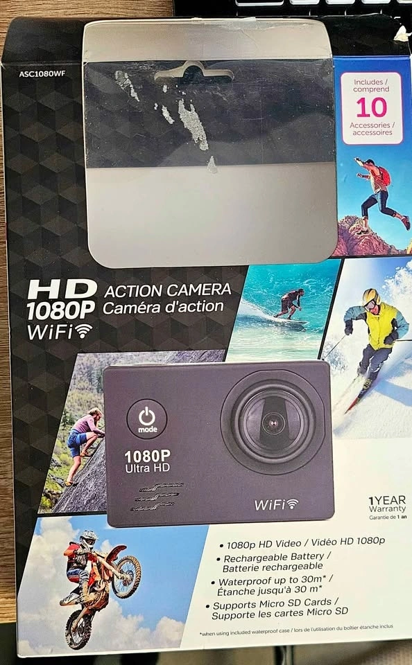I received this as a gift but only used it once and don't need it. It comes with all the accessories shown in the picture. Please note, it does not include a microSD card. It can also be used as a dashcam. Pick-up is in Welland.
