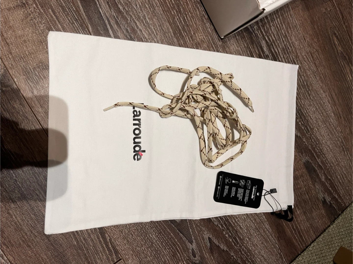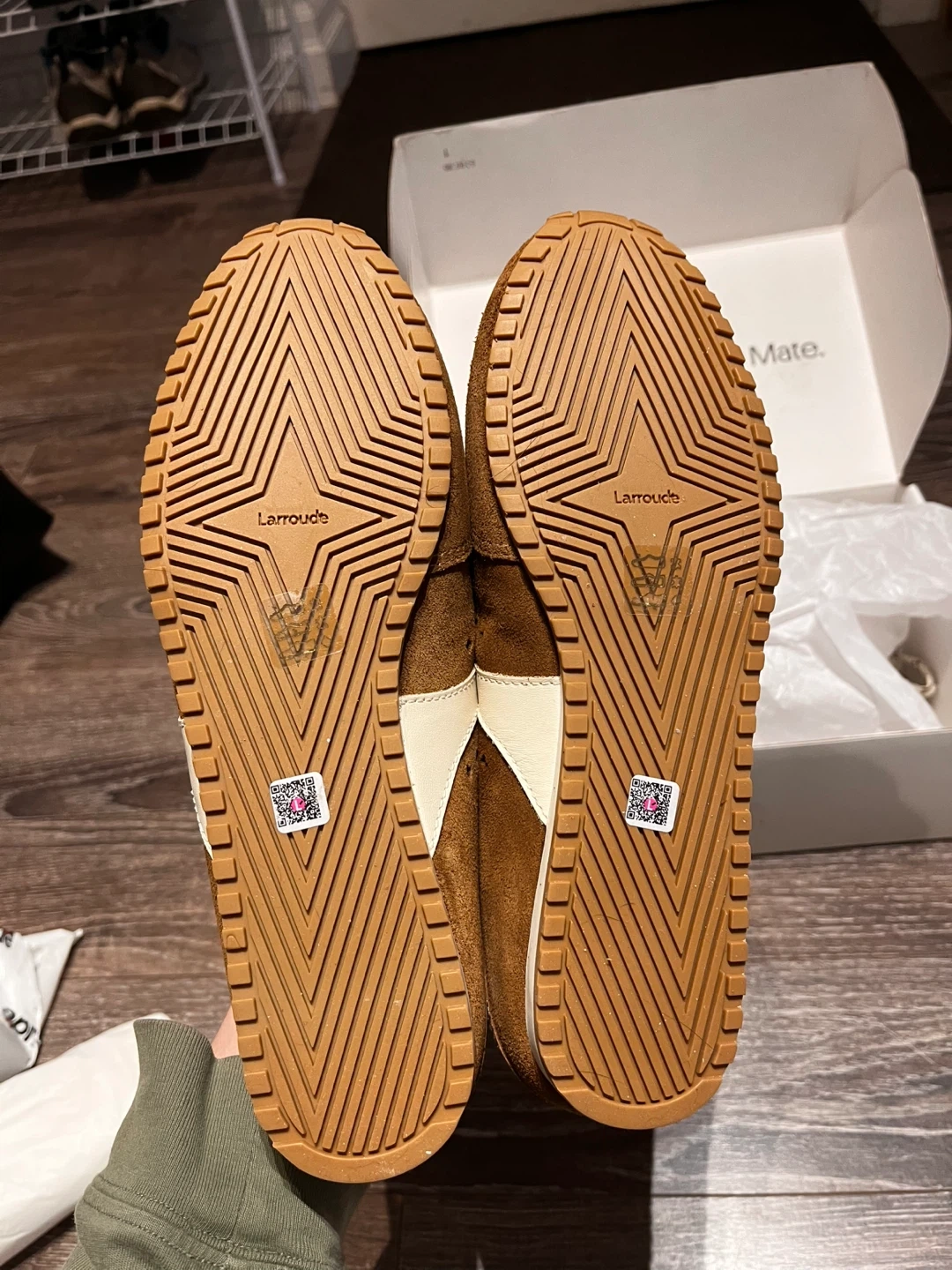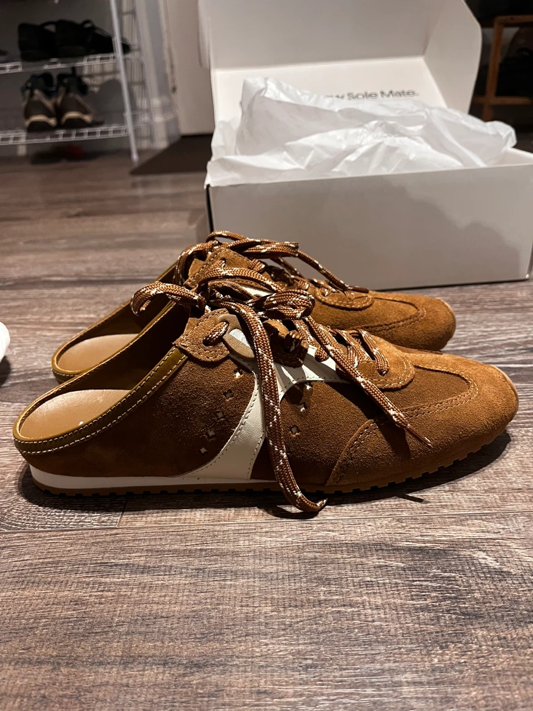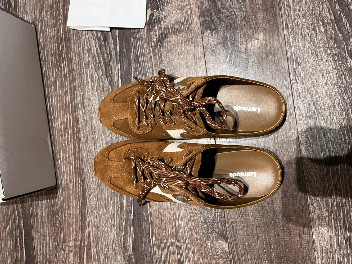 Larroude Stella Mule shoes in a brown suede finish. Features white accents and a lace-up front. Includes original box and packaging. These mules are size 10.