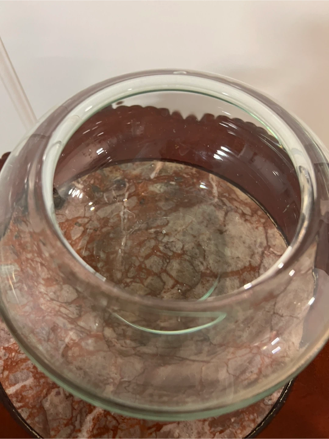 A charming glass candy dish topped with a decorative orange and green flower lid. It's made of clear glass and would look lovely on a vanity or side table. The dish measures approximately 7 inches tall.