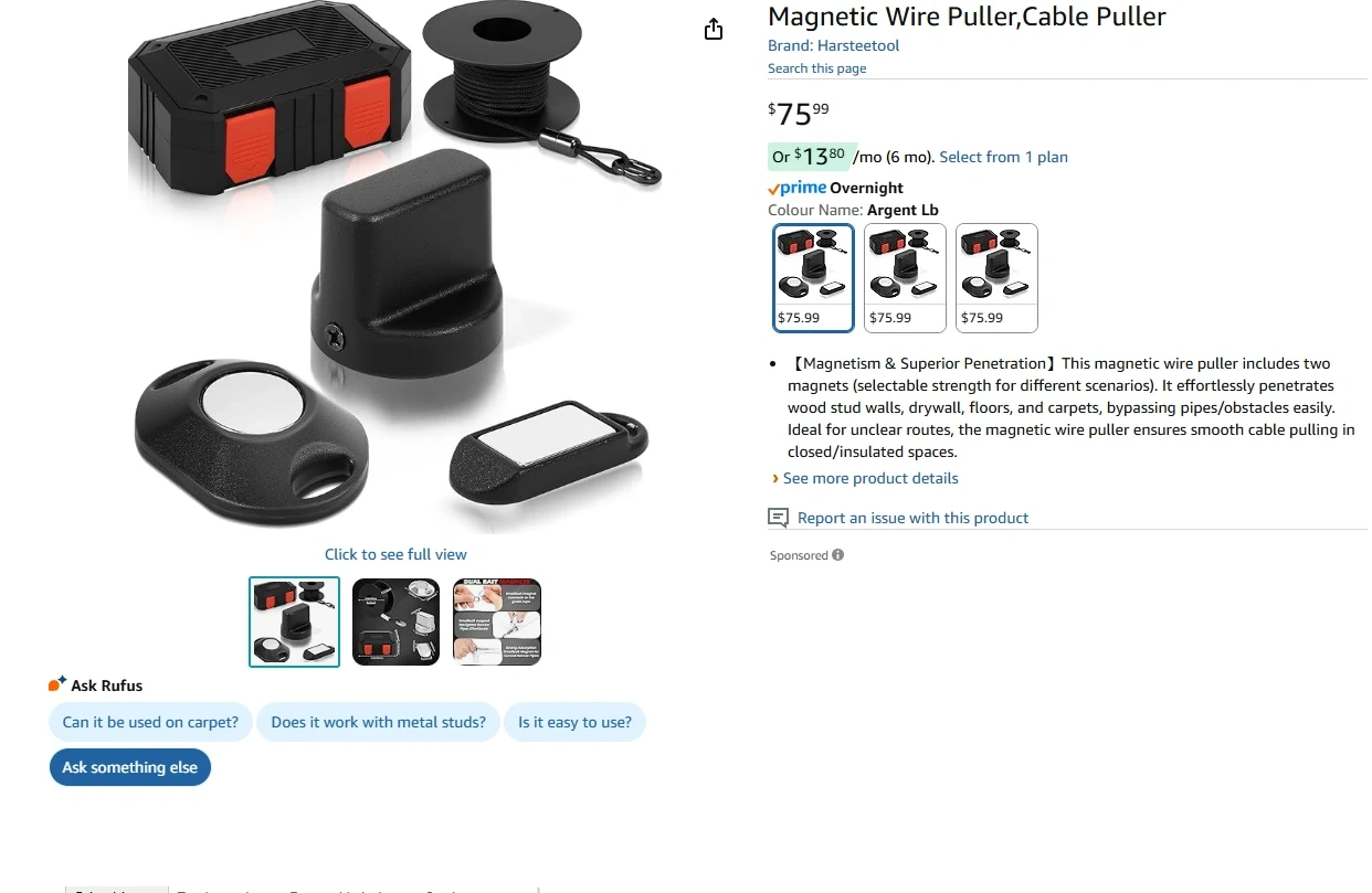 【Magnetism & Superior Penetration】This magnetic wire puller includes two magnets (selectable strength for different scenarios). It effortlessly penetrates wood stud walls, drywall, floors, and carpets, bypassing pipes/obstacles easily. Ideal for unclear routes, the magnetic wire puller ensures smooth cable pulling in closed/insulated spaces.