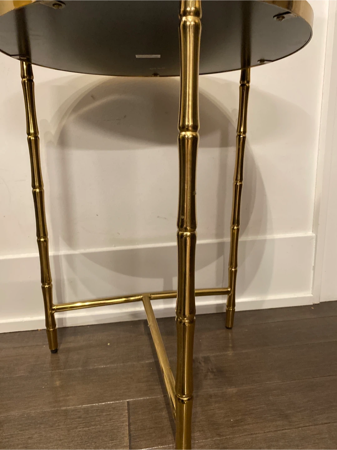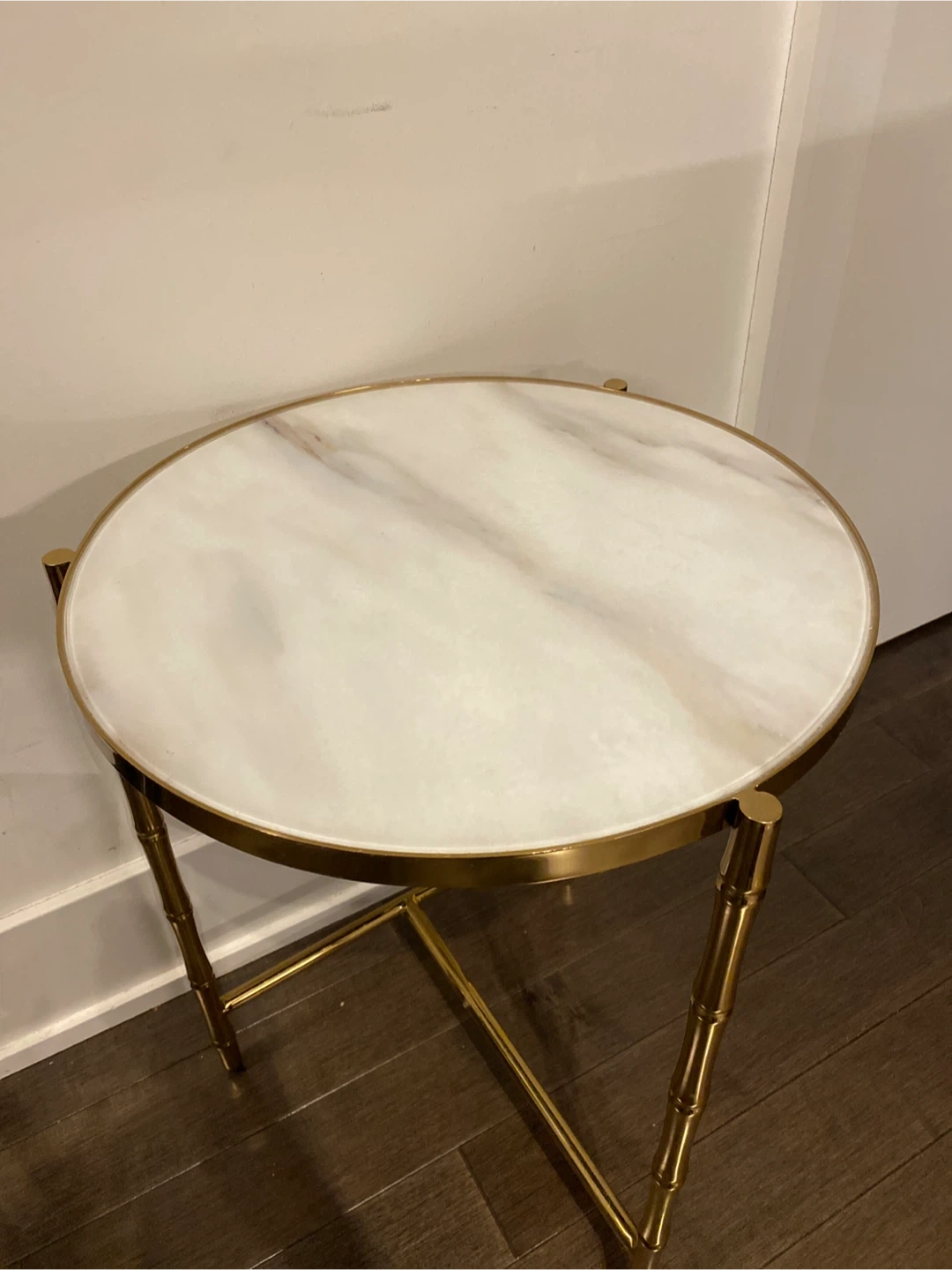 A stylish side table featuring a faux bamboo gold-tone metal frame and a round marble-look top. It's a great accent piece for any room, offering a touch of elegance. The table's compact size makes it handy for placing beside a chair or sofa.