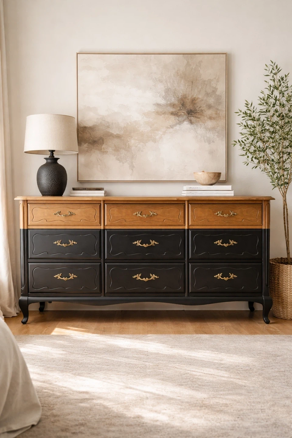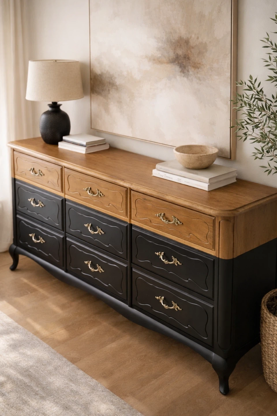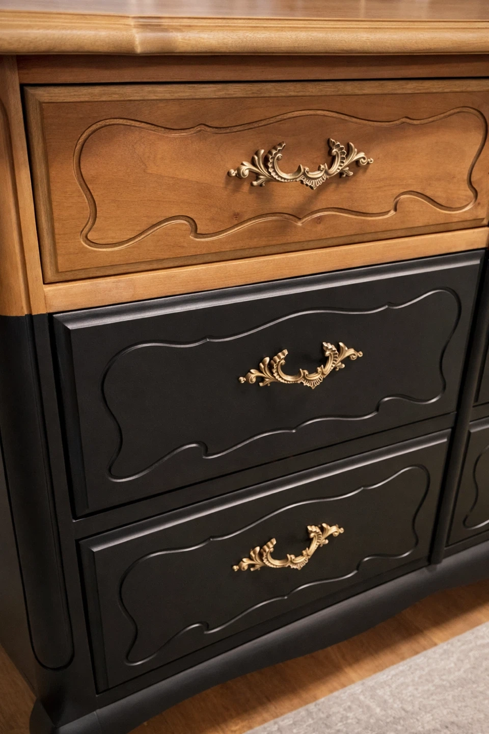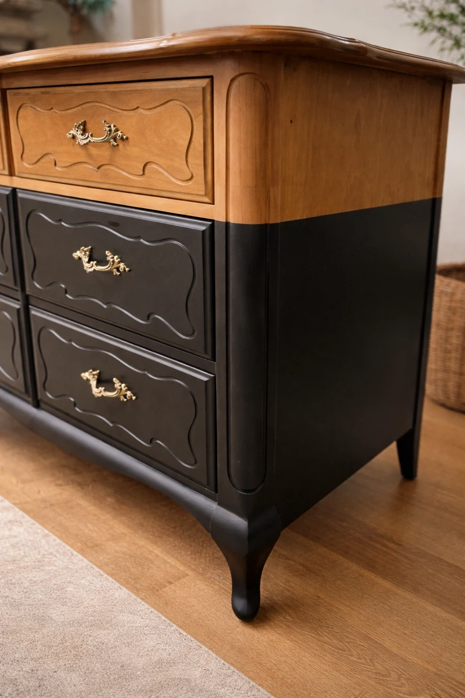 This piece pairs warm natural wood tones with a rich matte black body, creating depth, contrast, and sophistication. The original ornate brass hardware has been restored and polished, adding subtle elegance without overpowering the clean, updated look.