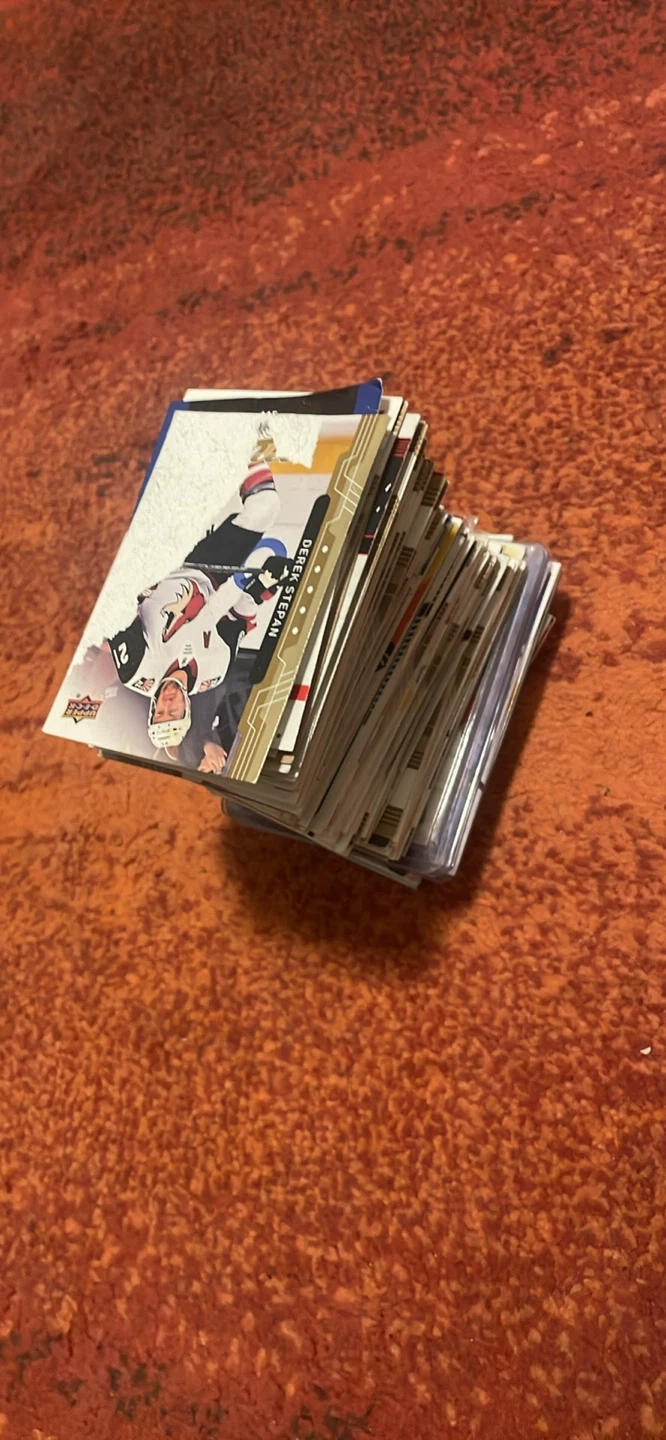 A collection of assorted hockey cards is available. These cards feature various players and designs. They are suitable for collectors or enthusiasts. Contains