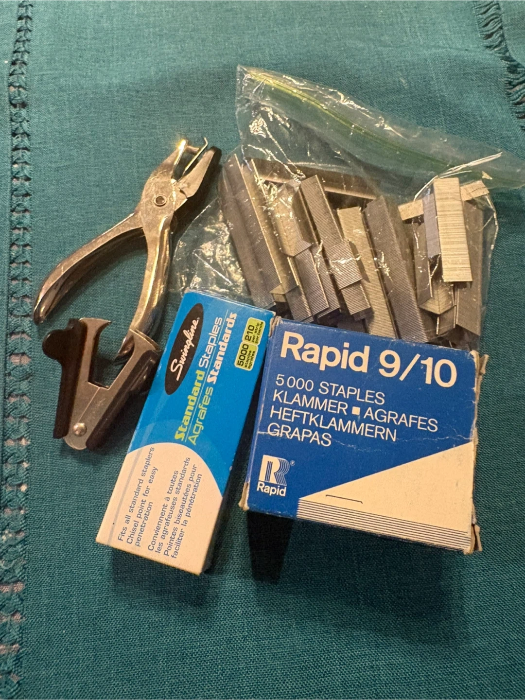 Includes a Swingline staple remover with a chisel point for easy penetration. Also includes a box of Rapid 9/10 staples, containing 5000 staples. The staples are standard size. Single hole punch too.