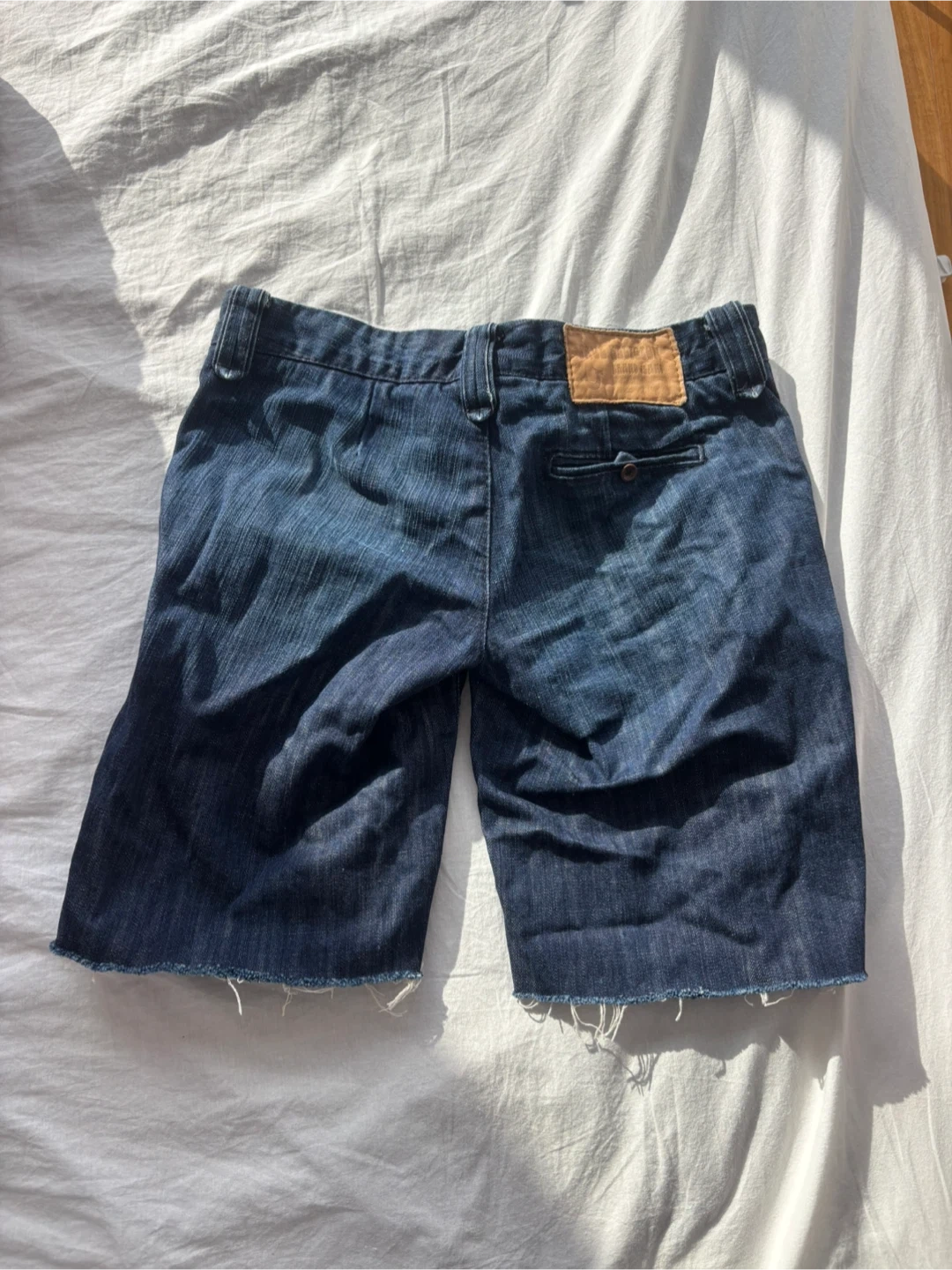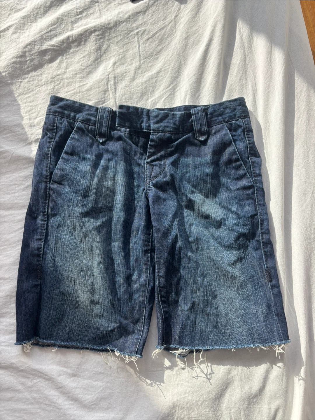 These are True Religion denim shorts in a size 27. They're a classic blue denim with a raw hem.
