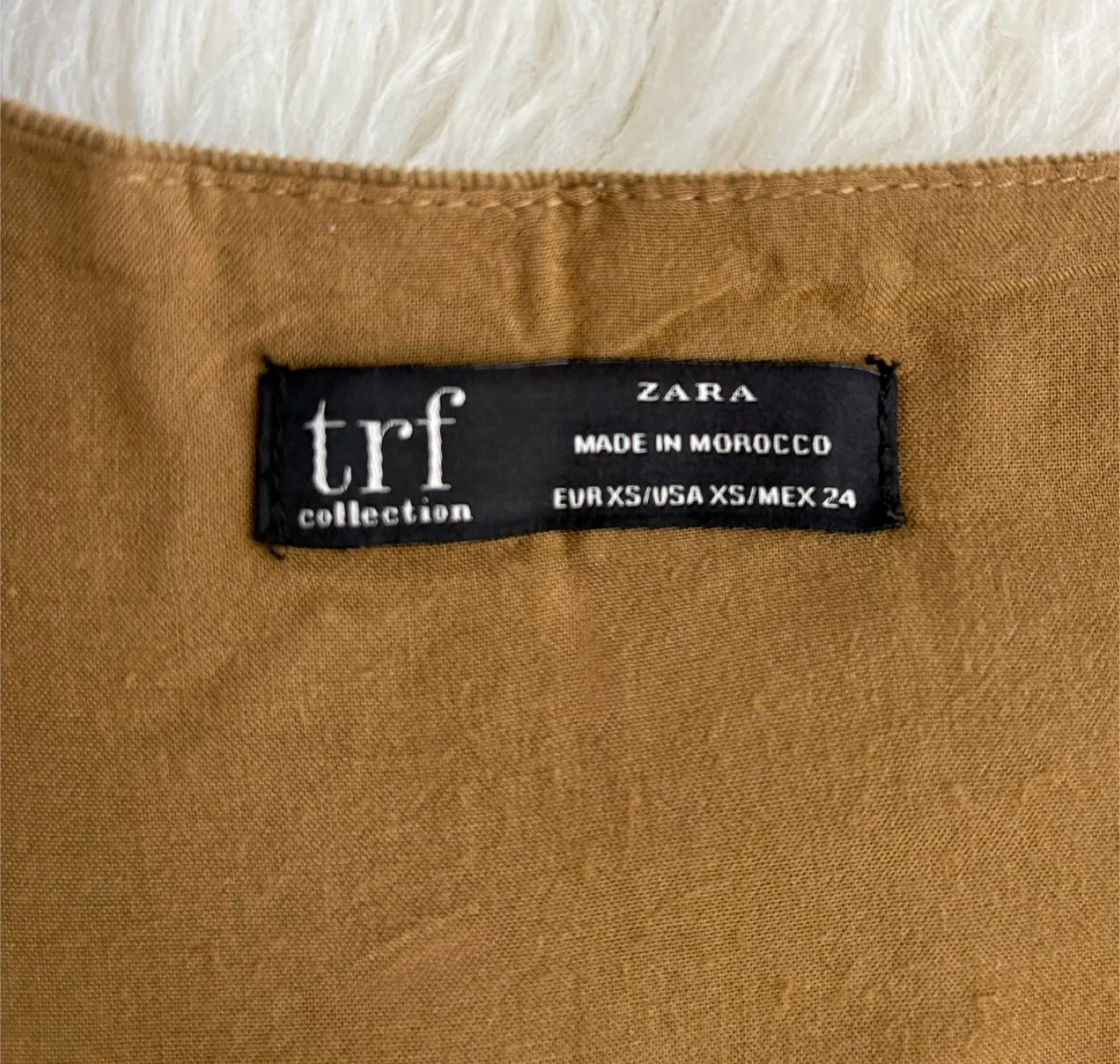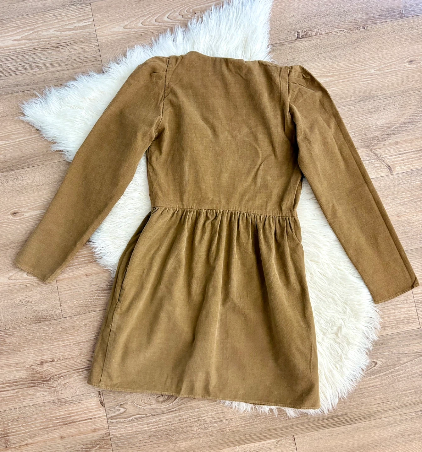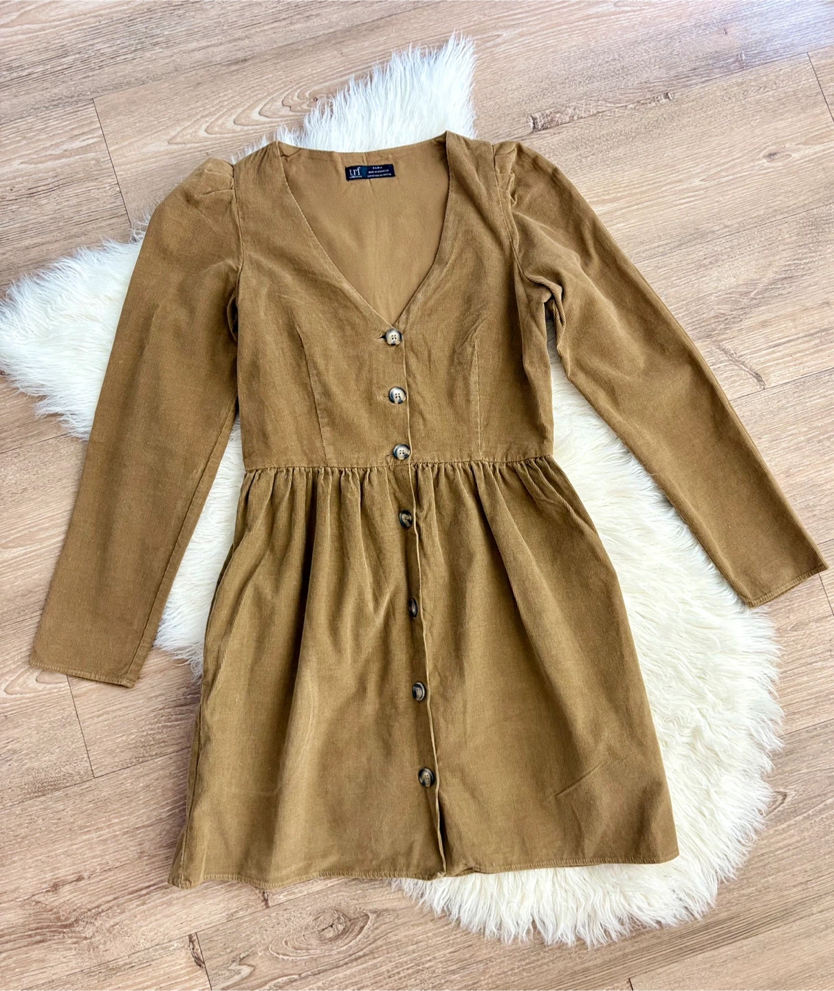 This Zara TRF Collection dress is a lovely brown corduroy with a button-up front. It's a size XS. The dress features long sleeves and a flattering A-line skirt with gathering at the waist.