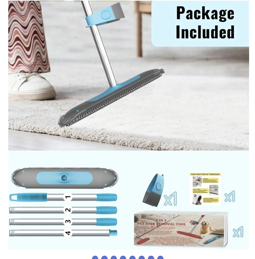 This 3-in-1 pet hair removal tool.. It comes with an adjustable extension pole for easy reach. The tool's serrated edges and rubber bristles effectively grab embedded pet hair from carpets and furniture.