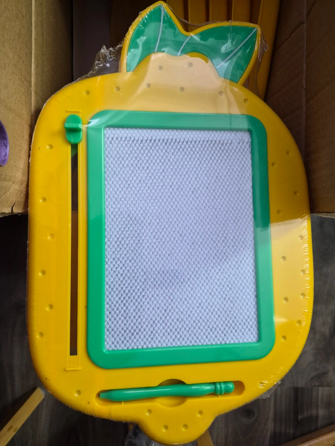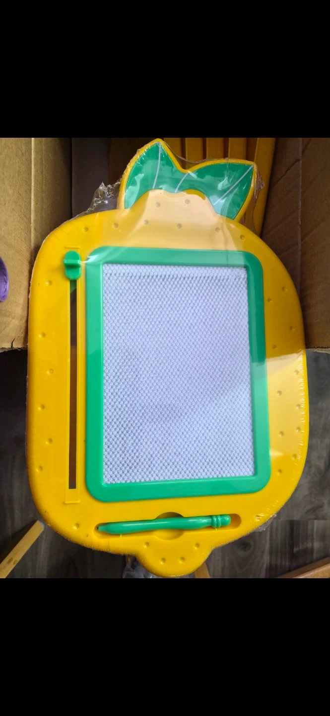 This is a lemon-shaped magic drawing board with a green frame. It includes a stylus and a sliding eraser bar. Fun for young artists!