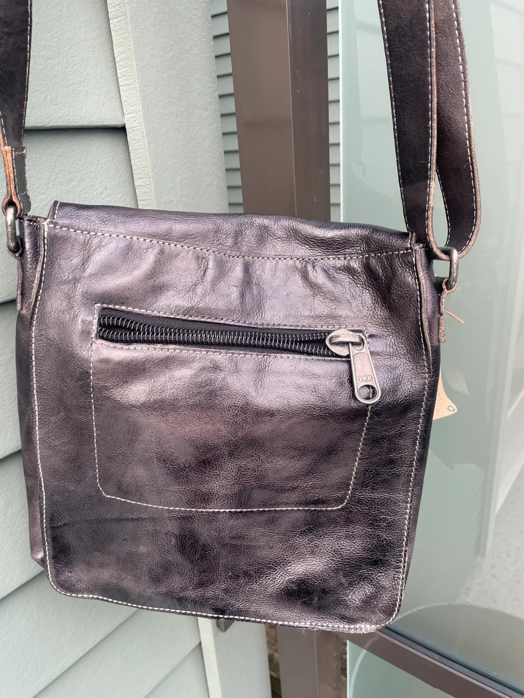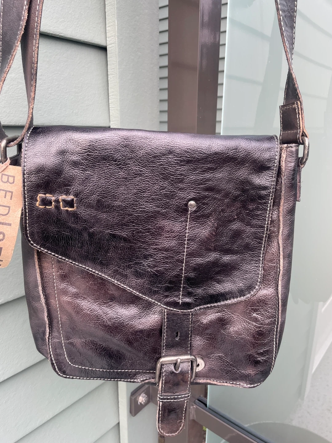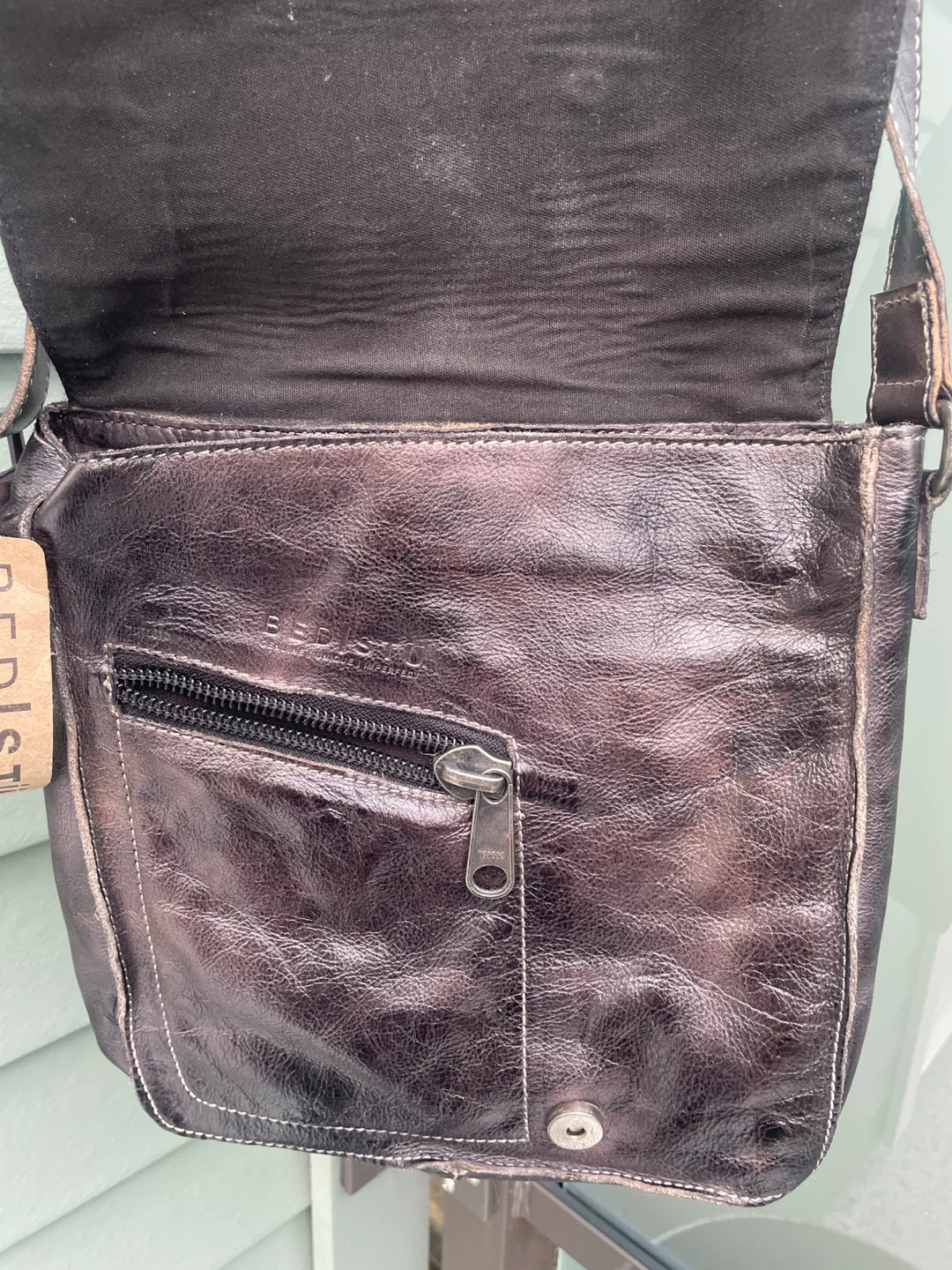 This is a Bed Stu crossbody bag in a black rustic leather. It's a stylish and durable bag that's perfect for everyday use. The bag features a buckle closure and a zipper pocket inside. 10.5” x 9” brand new
