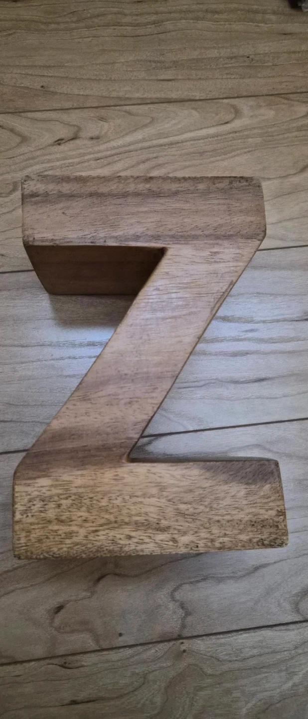 Set of two wooden alphabet letters, "A" and "Z". These decorative letters are made of solid wood with a natural finish. They're great for shelf styling or as unique home accents. Wood material.