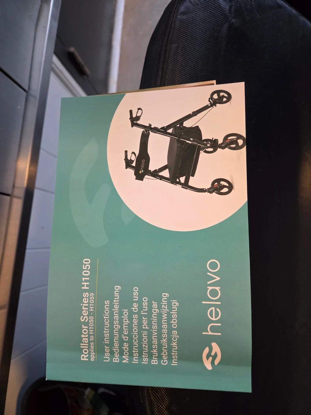 This is a Helavo H1050 rollator with a seat and basket. It's a black, four-wheeled walker. It features adjustable handles and a convenient cup holder. This rollator is designed to assist with mobility and provides a place to sit. Bought Nov. 2025. Used once indoors.