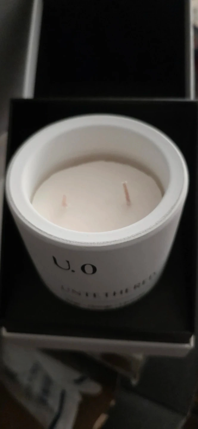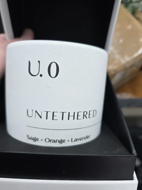 UO Untethered candle with a Sage, Orange, and Lavender scent. It has a double wick and comes in a white ceramic-style vessel. This candle's fragrance blend is designed to create a relaxing atmosphere.