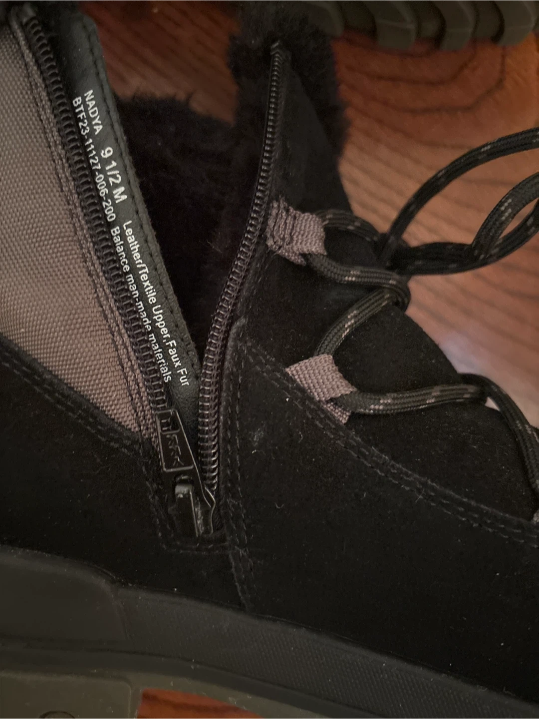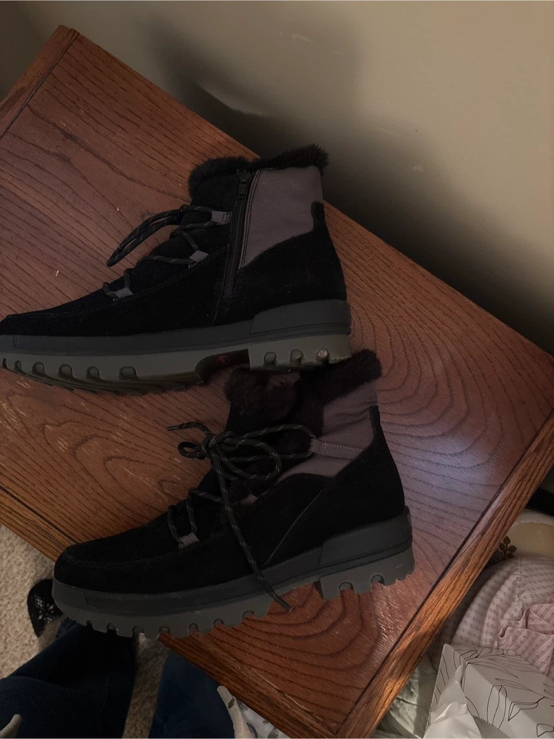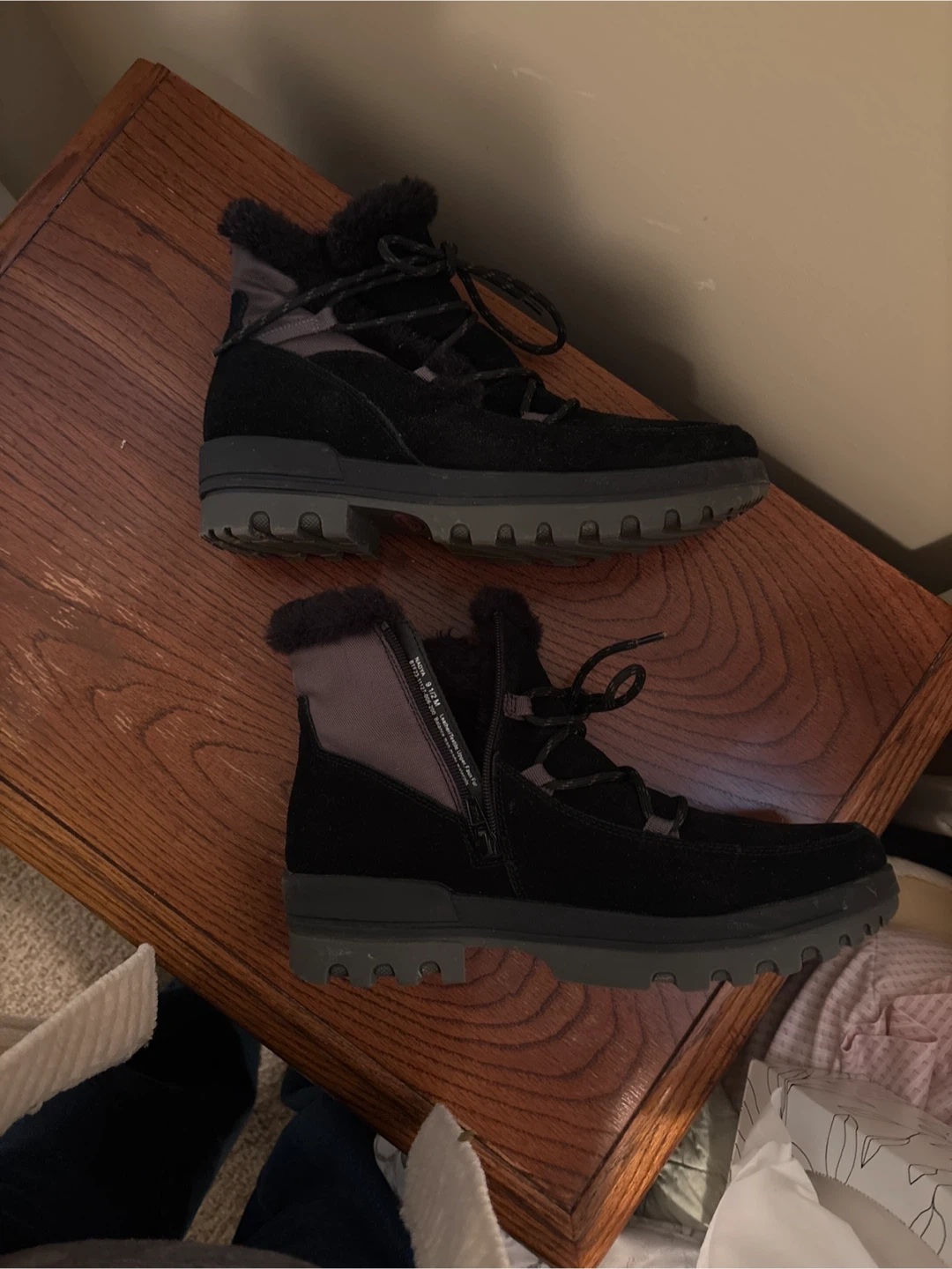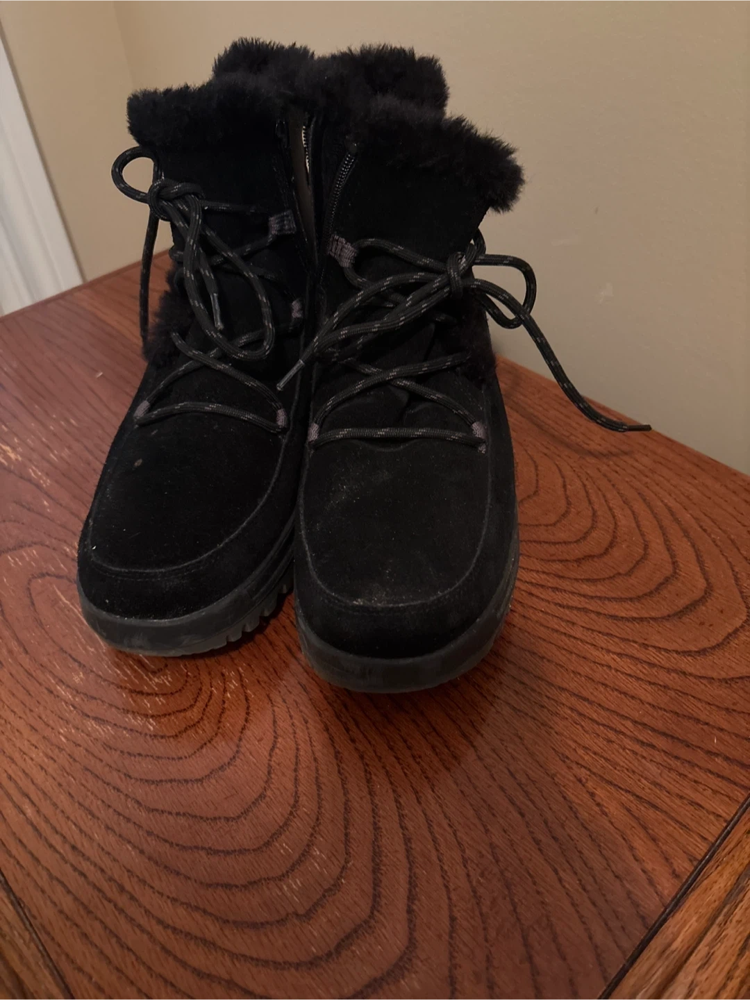 Comfortable black winter boots, worn 1 or 2 times, size 9.5 M. They're made with a leather/textile upper and faux fur lining for warmth. Featuring a side zipper and lace-up front for a secure fit.