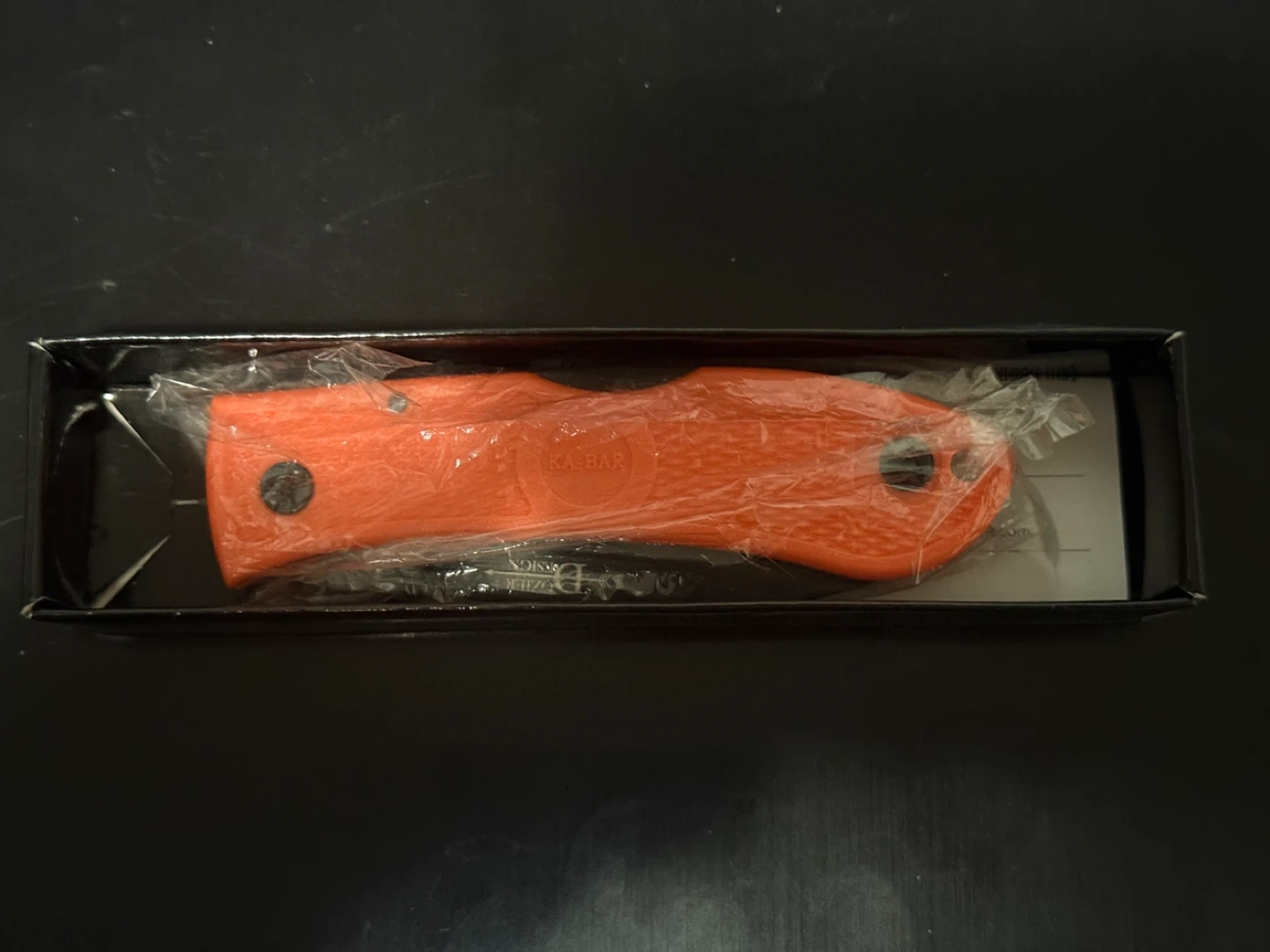 This KA-BAR Dozier Folding Knife features an orange handle and a black blade. It's a Dozier Design Master Series knife. Very light knife, Includes original box.