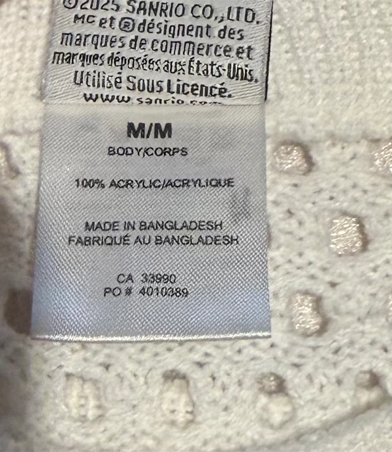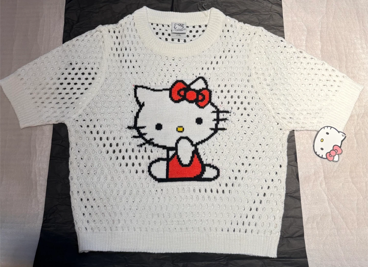 Beautiful white crochet-style knit with a large Hello Kitty face on the front.