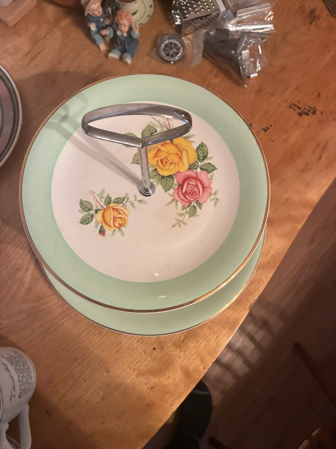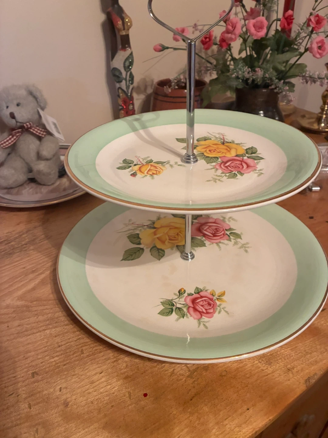 A two-tiered stand featuring a vintage floral pattern with roses. It has a light green rim and a chrome-plated metal handle. This stand is perfect for serving desserts or snacks.