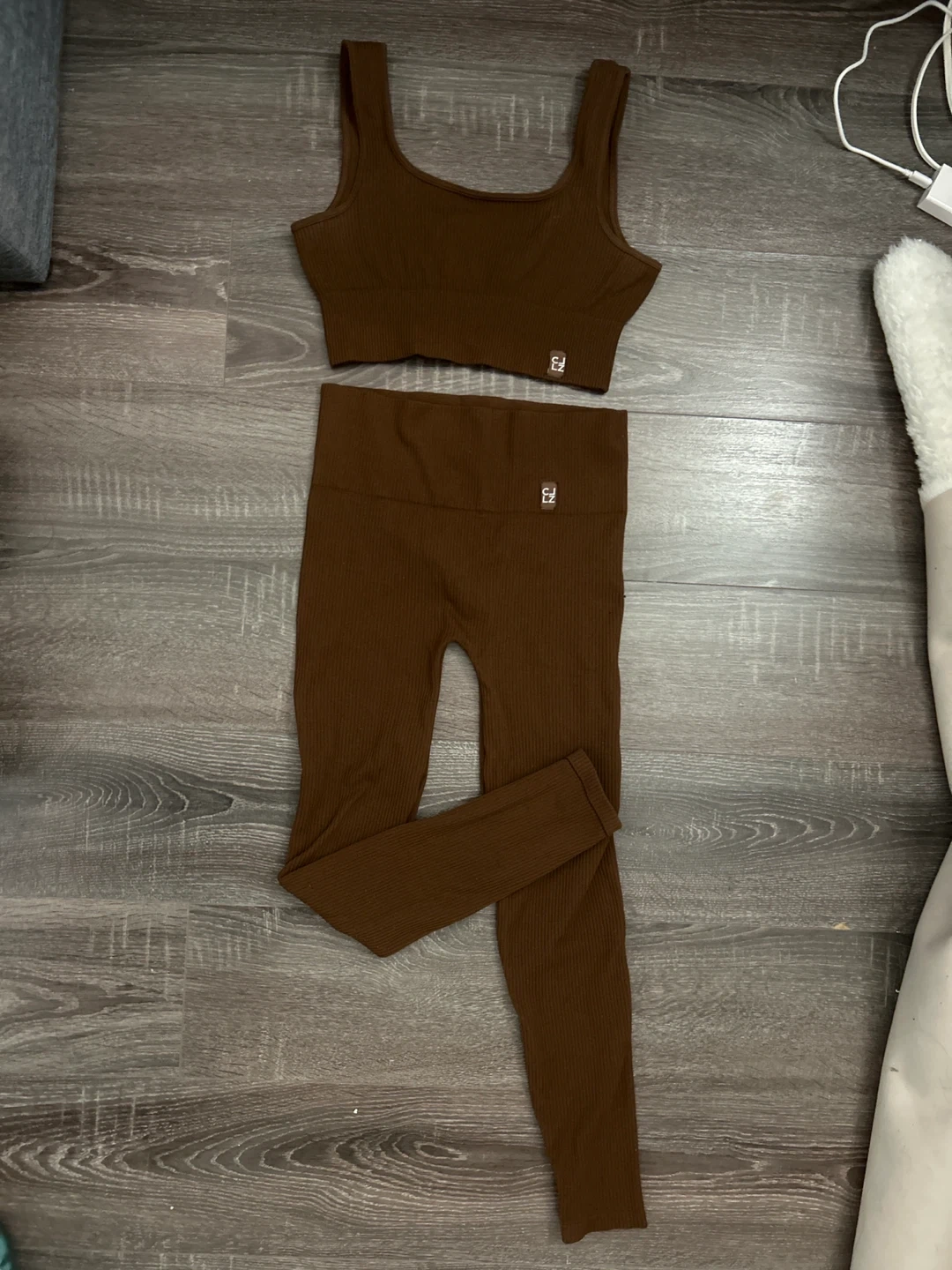 Selling a Calzedonia activewear set in a lovely brown colour! This set includes a sports bra and leggings, both in a ribbed texture. The size is a 'TU-ONE SIZE'. It's in great condition and ready for your next workout or cozy day in!