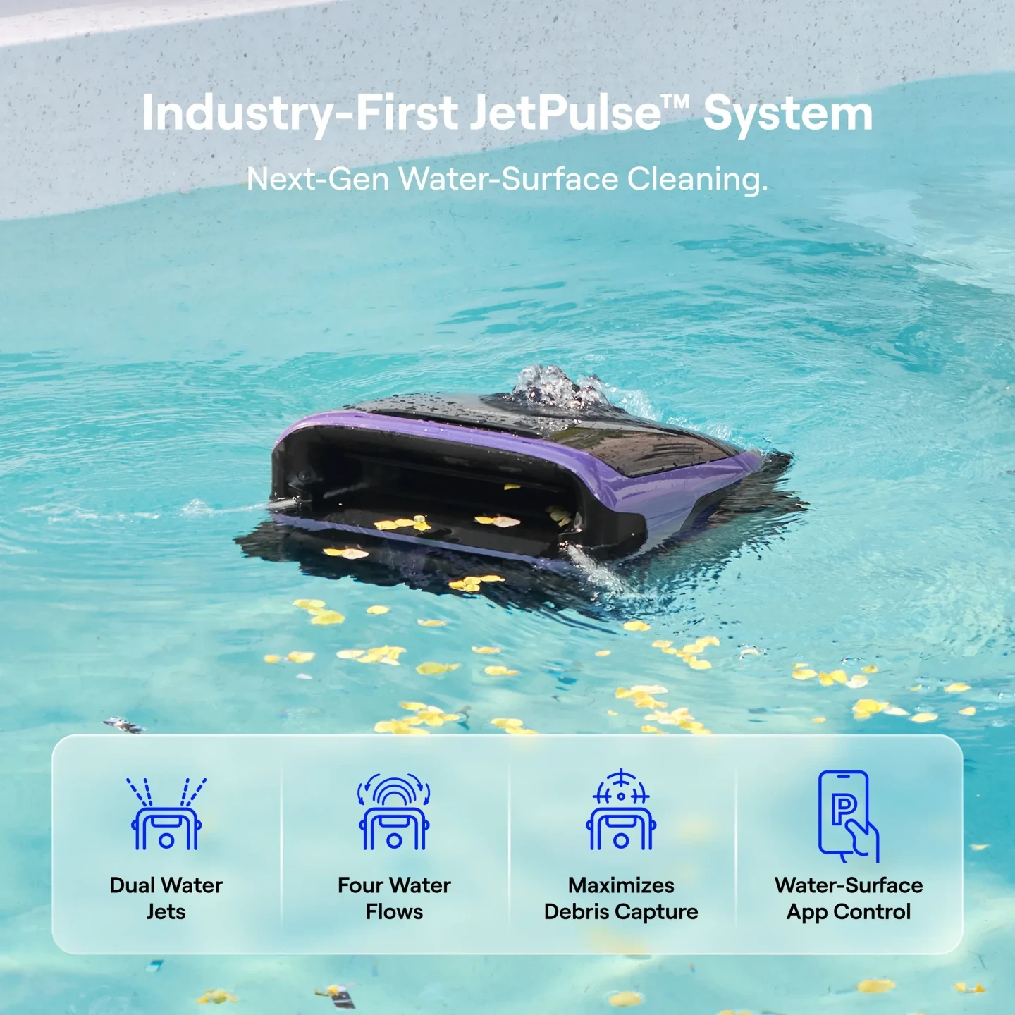 JetPulse™ Water Surface Cleaning — Twin jets actively pull debris inward, not push away, for faster, more efficient cleaning.