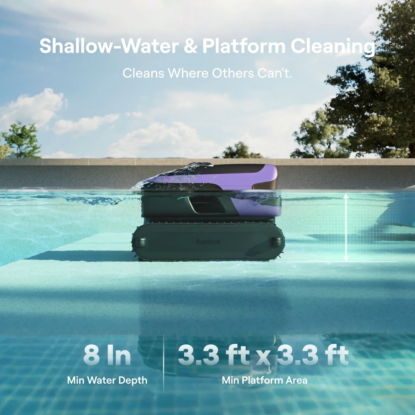 Complete 4‑Zone + Platform Coverage — Cleans surface, floor, walls, waterline, and shallow platforms as low as 8 inches.