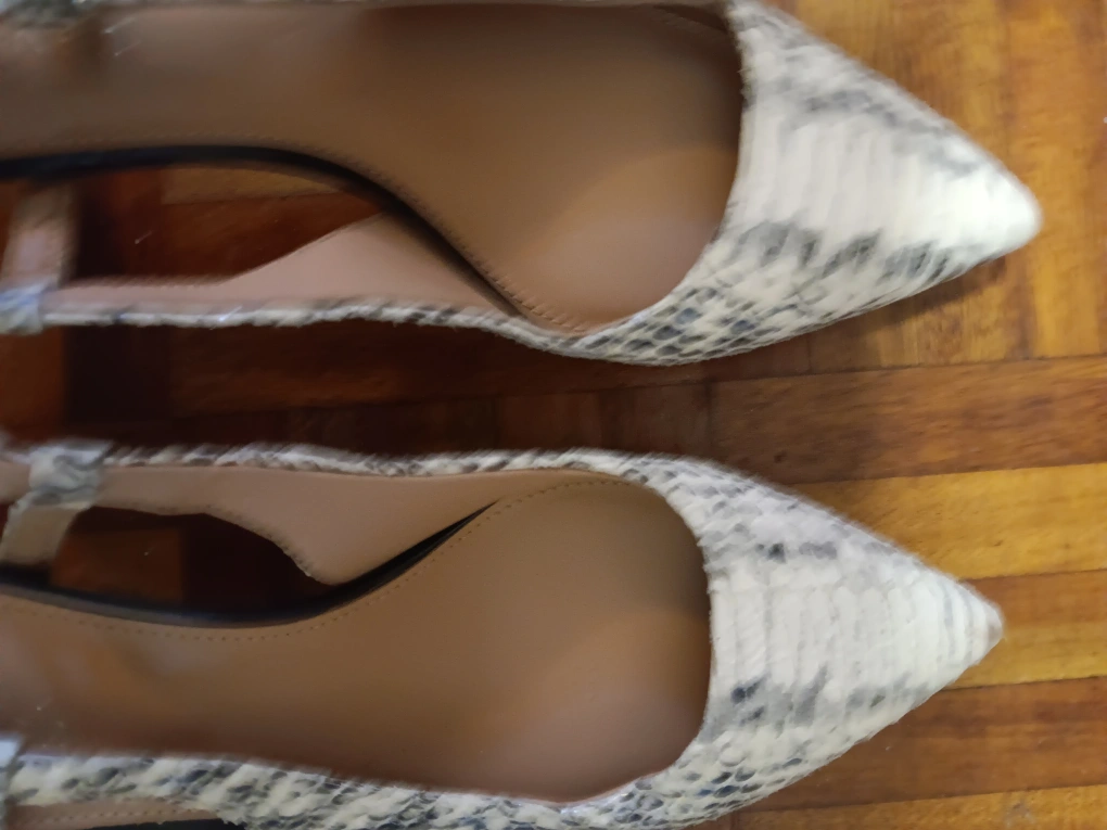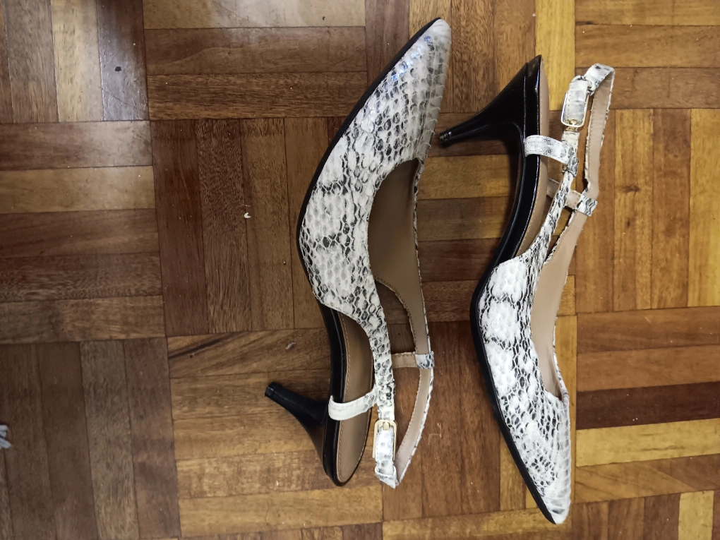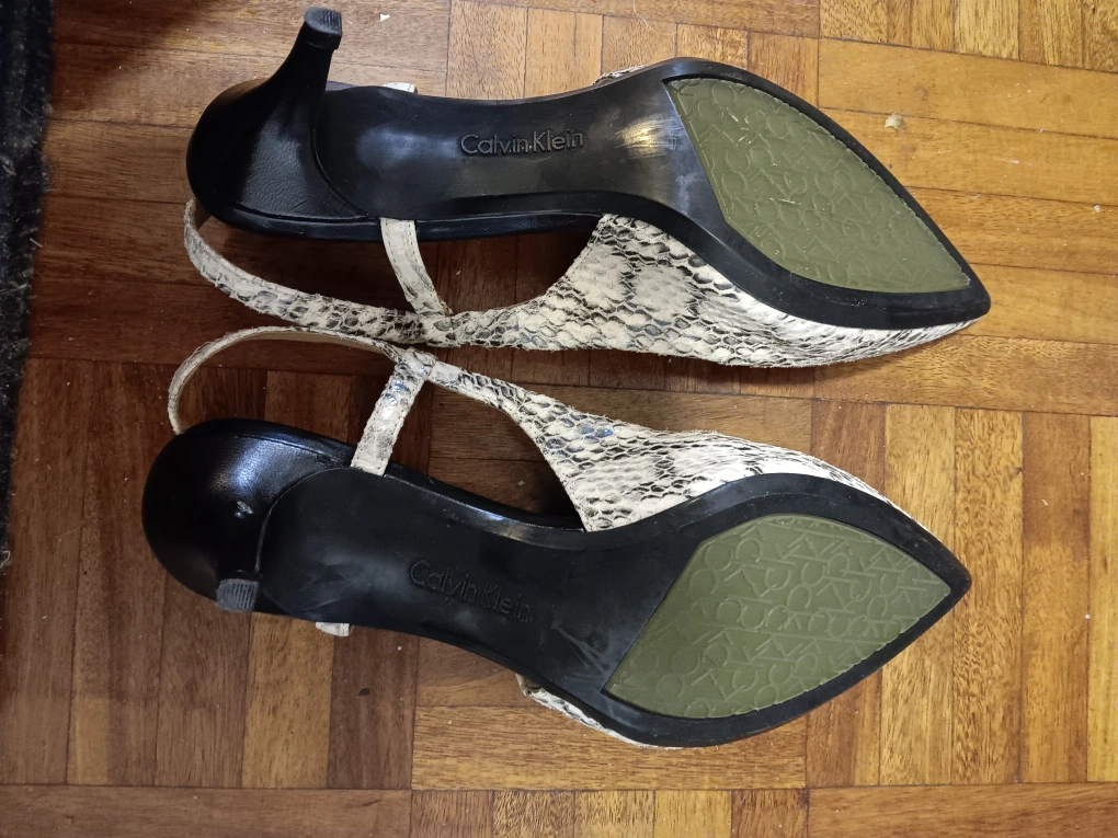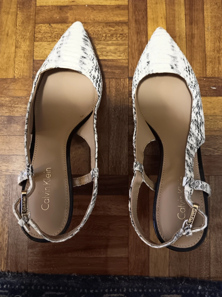 Women's Calvin Klein slingback heels. Snakeskin print. Pointed toe. Low heel. Excellent condition.
