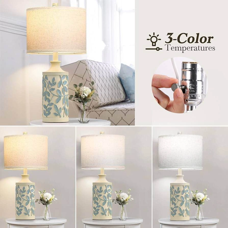 Set of 2 farmhouse cream table lamps, perfect for a bedroom nightstand or living room end table. These rustic lamps feature a vintage design with a resin body and offer 3 color temperatures. Bulbs are included.