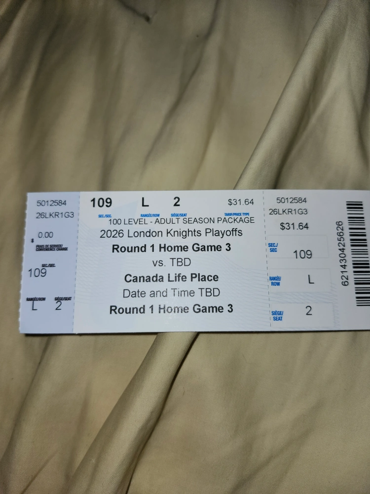 Ticket for the 2026 London Knights Playoffs Round 1 Home Game 3. Event to be held at Canada Life Place. Date and time are TBD. for game 5 tonight