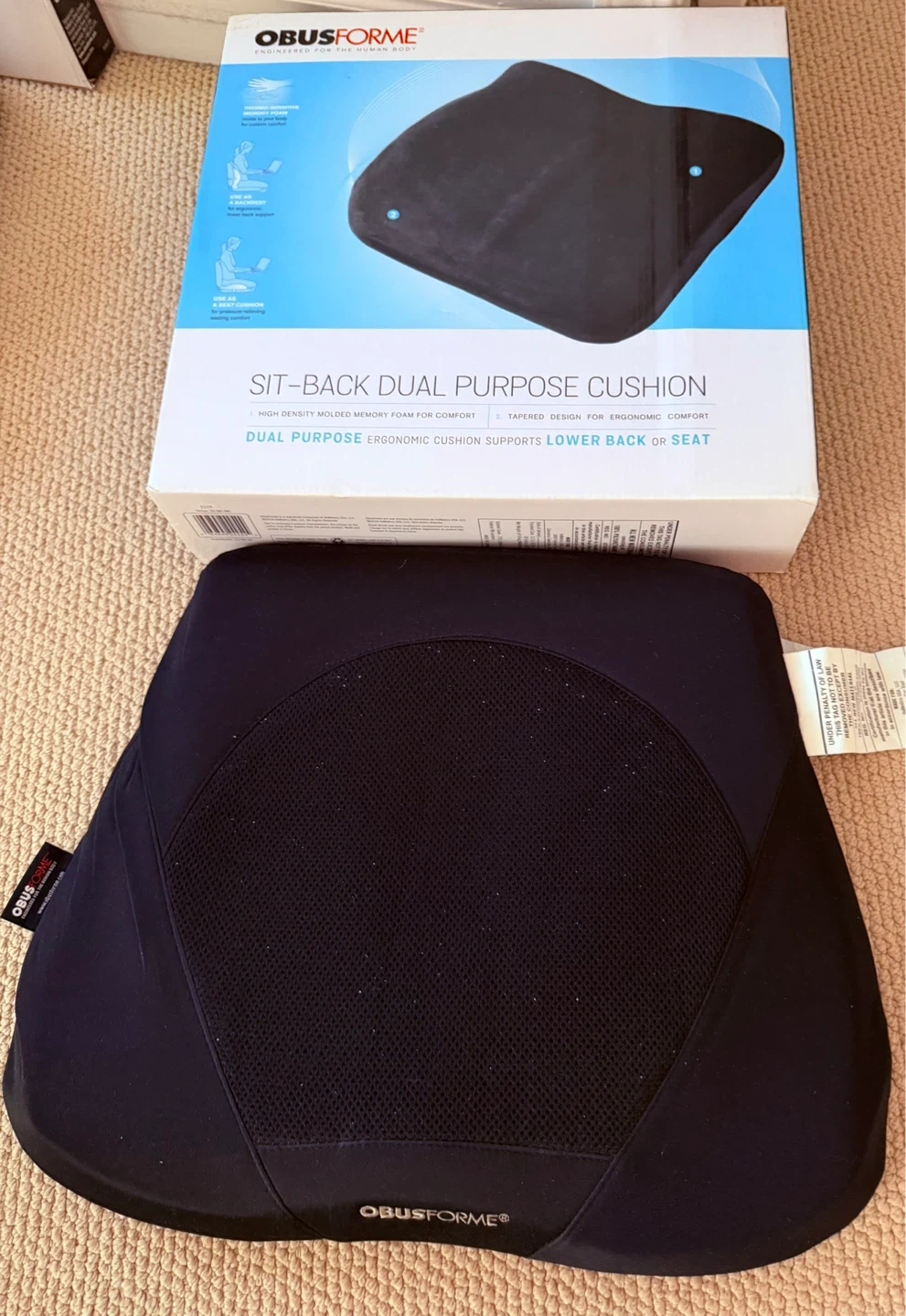 This Obusforme Sit-Back Dual Purpose Cushion is made with high-density molded memory foam for comfort. It features a tapered design for ergonomic support. This cushion can be used as a backrest or as a seat cushion for pressure-relieving comfort.
