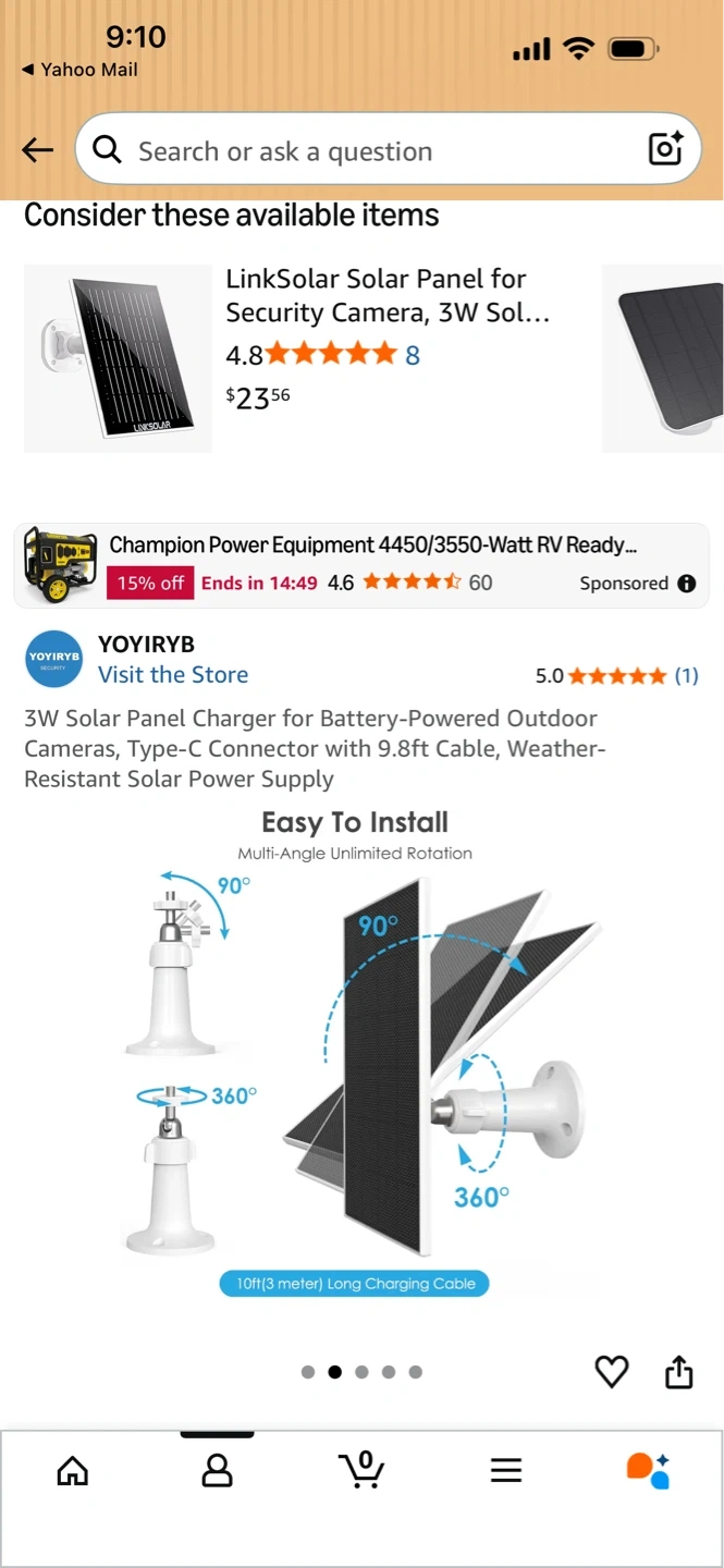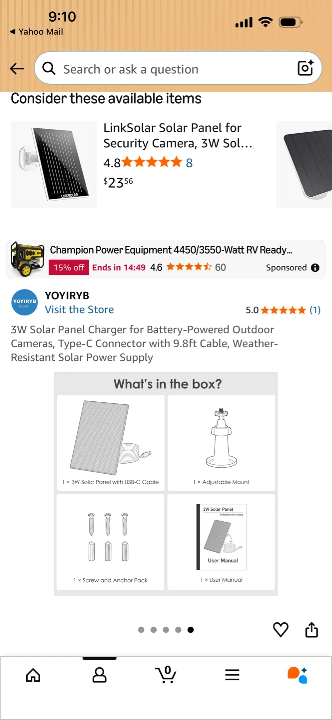 3W solar panel charger for battery-powered outdoor cameras. It's compatible with Type-C connectors and includes a 9.8ft cable. Also comes with an adjustable mount, screw and anchor pack, and a user manual. Weather-resistant design for outdoor use.