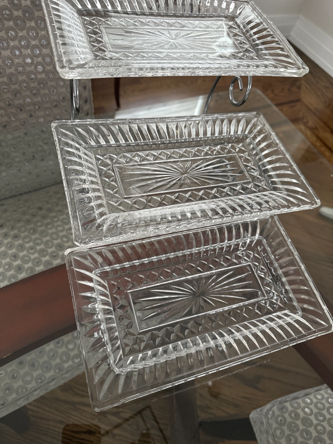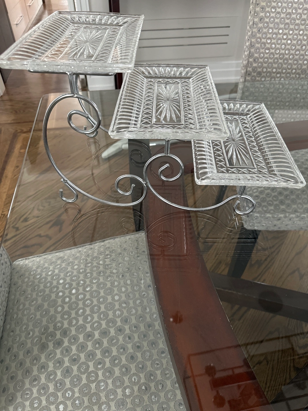 Elegant three-tiered serving stand. Features three rectangular crystal glass serving platters. Metal stand with a decorative scrolled design. Perfect for parties or everyday use.