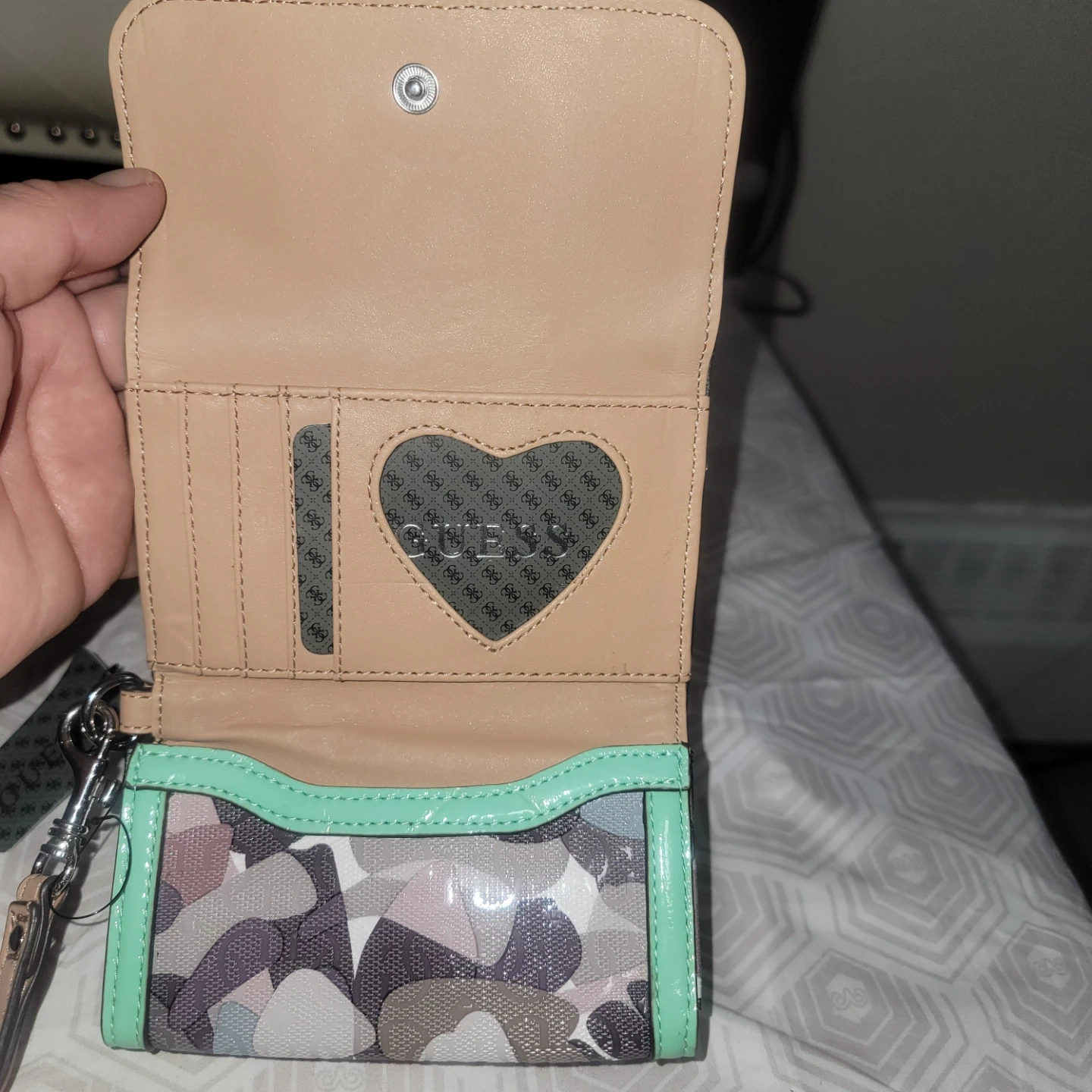 A compact Guess wallet with a colourful abstract pattern and mint green trim. It's got card slots inside and a snap closure. Perfect for keeping your essentials organized!