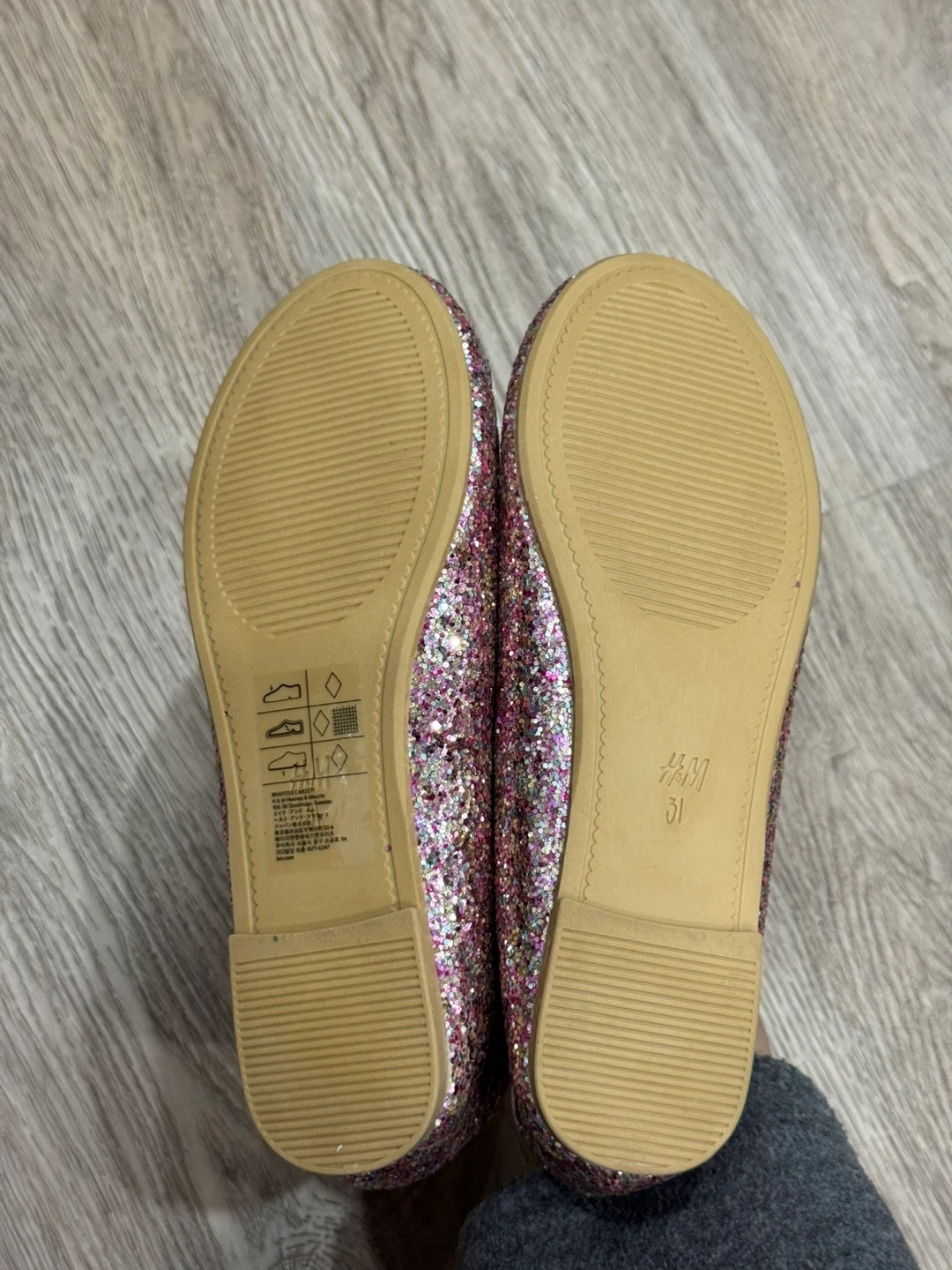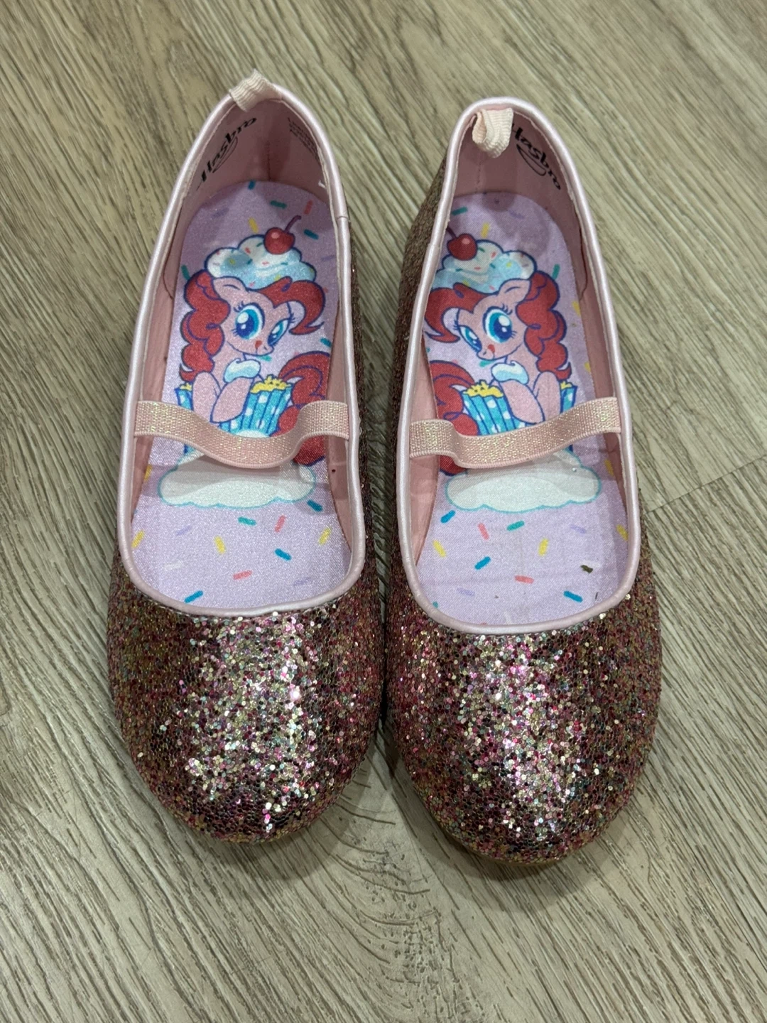 Sparkly glitter ballet flats. My Little Pony characters on the insoles and a pink elastic strap across the top. Children size 13 US, EUR 31.