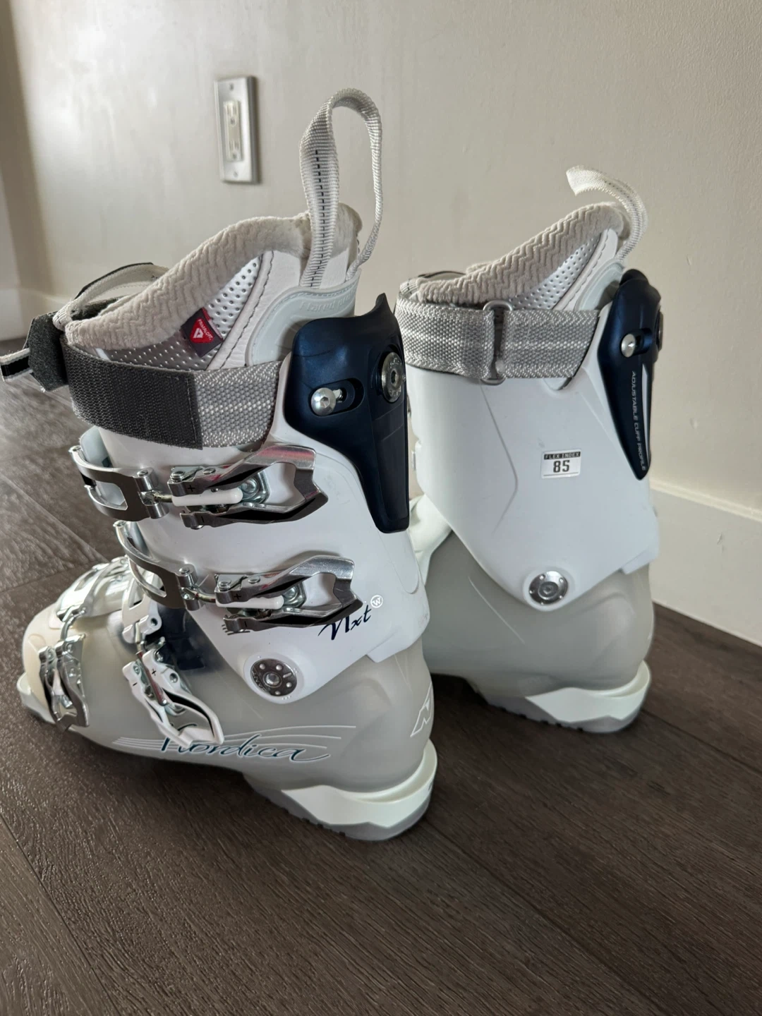 White Nordica ski boots with a comfortable ICE COMFORT liner. They're a size 25.5 with a flex rating of 85. Multiple buckles for a secure fit.
