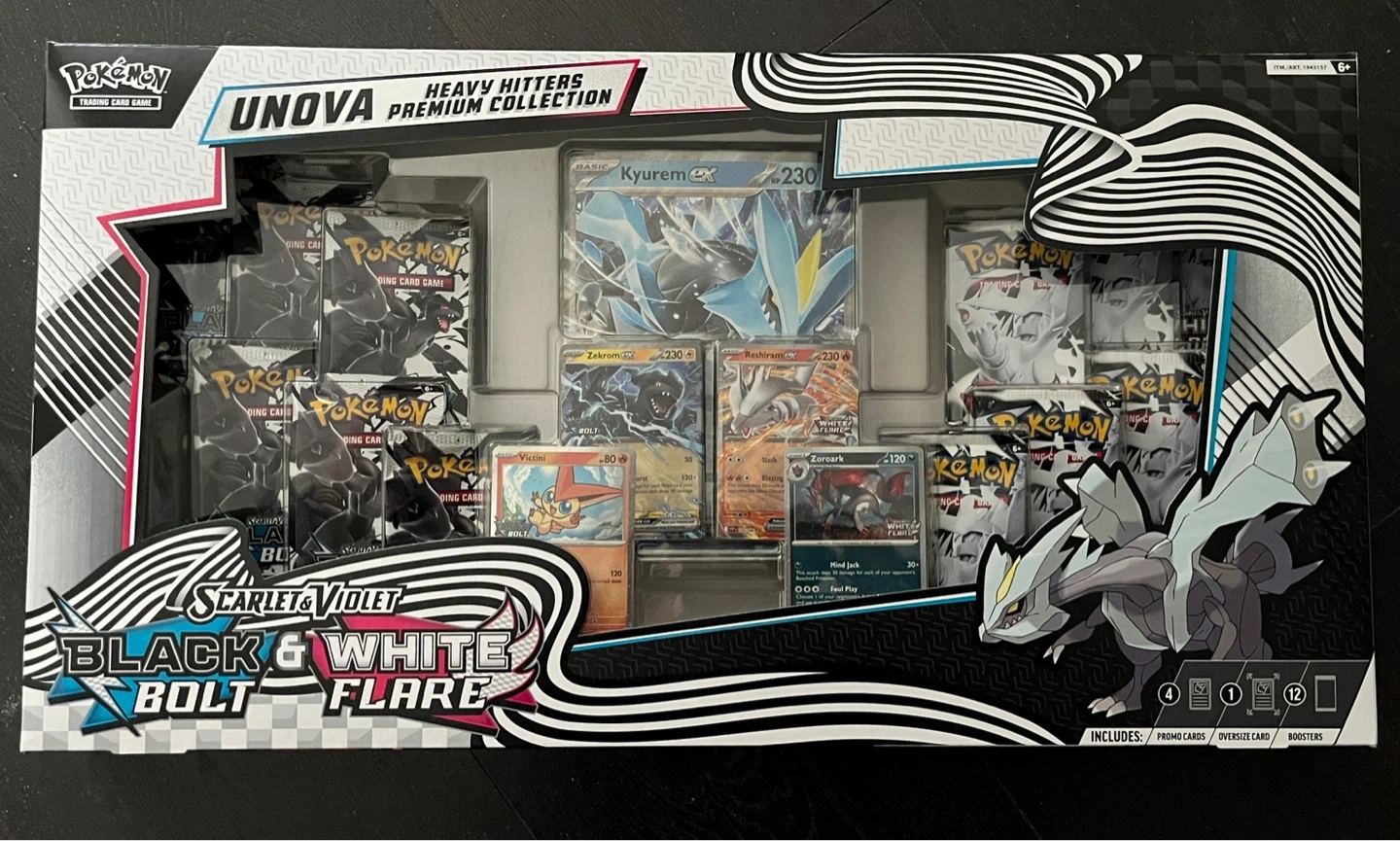 Have an extra Unova Heavy Hitters Premium Collection. Contains 12 booster packs, 4 promo cards and an oversized promo card. Perfect for any Pokemon trainer or collector!