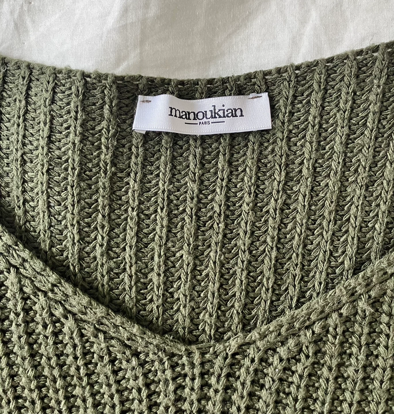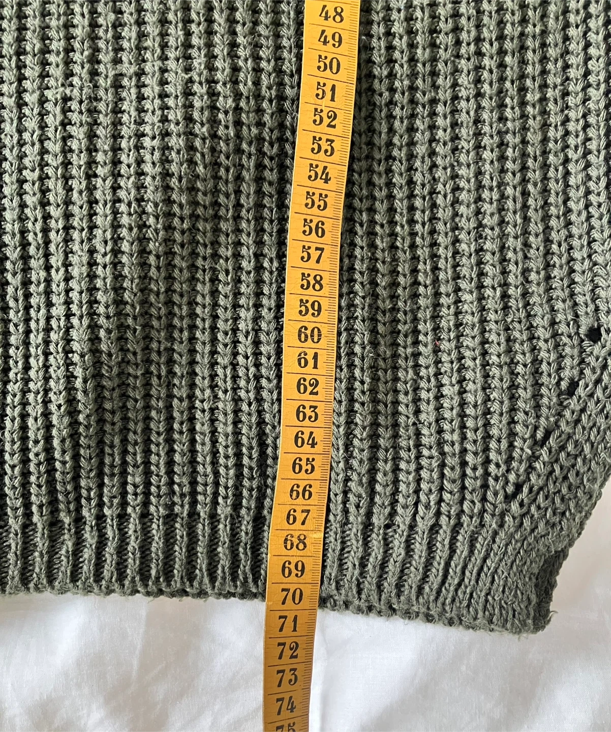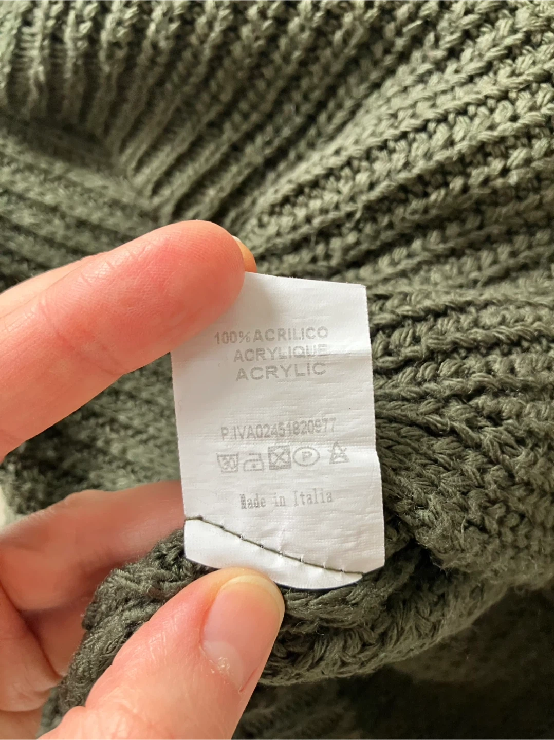 Cozy olive green sweater. Has a V-neck and chunky knit. Made in Italy. No size on tag but fits S-M.