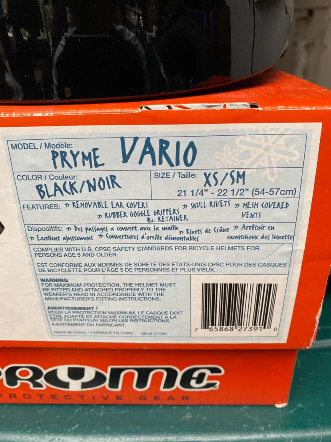 This is a Pryme Vario helmet in black. It's a size XS/SM, fitting 54-57cm (for child around 5-12 yrs). It has ear covers and rubber goggle grippers. Excellent condition, still comes with original box.
