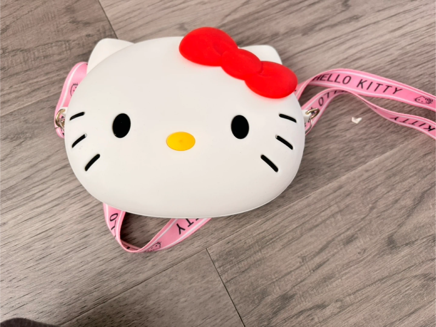 This cute Hello Kitty coin purse is perfect for keeping your loose change organized. It features the iconic Hello Kitty design with a red bow and a pink strap that says 'Hello Kitty'. It's made of a durable material, suitable for kids or anyone who loves Hello Kitty!