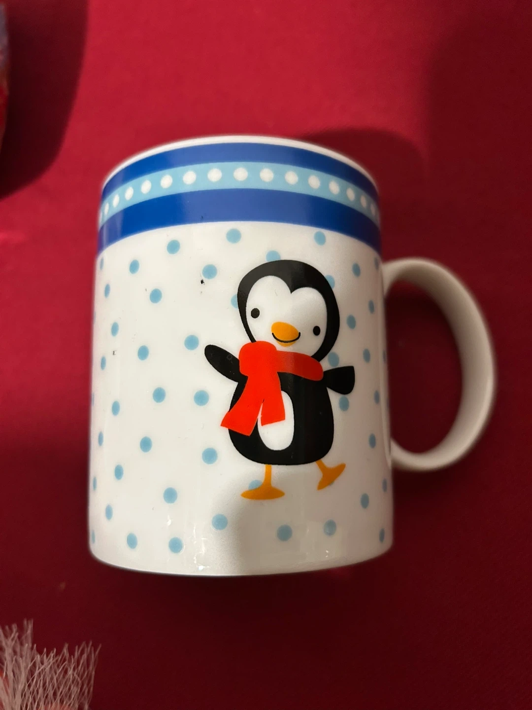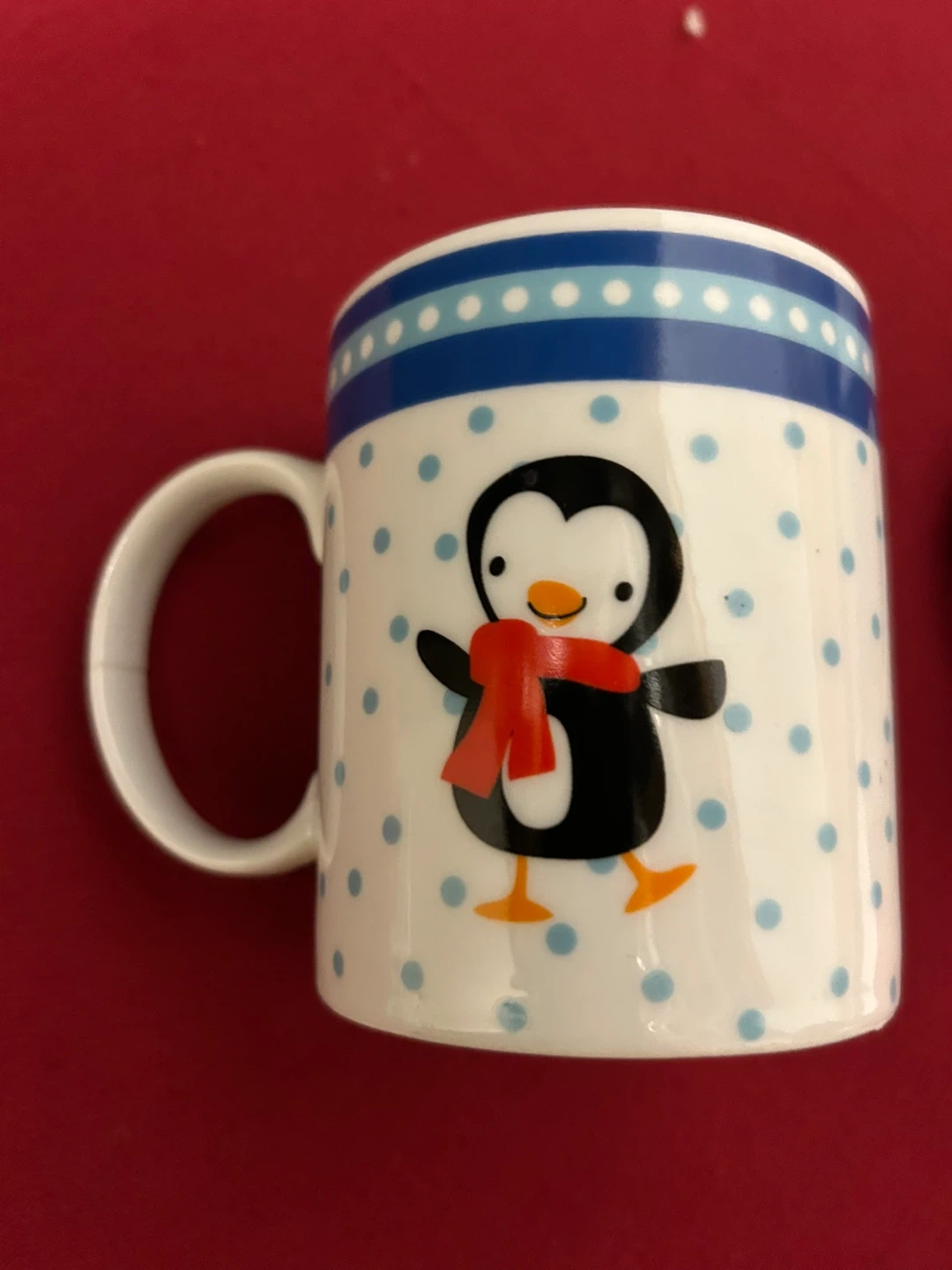 Two mugs feature a cute penguin with a red scarf, and the other has a festive gingerbread house design. Perfect for enjoying a warm drink during the holiday season