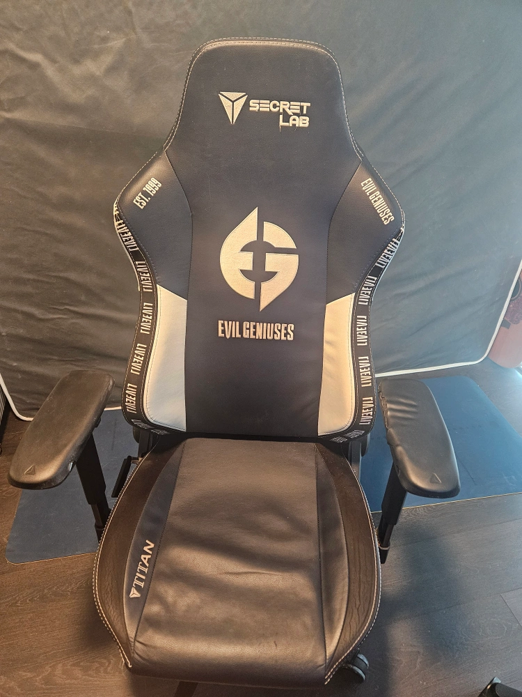 This is a Secretlab Titan gaming chair with an Evil Geniuses logo. It comes with adjustable armrests and a lumbar support system. The chair is in good condition but used.