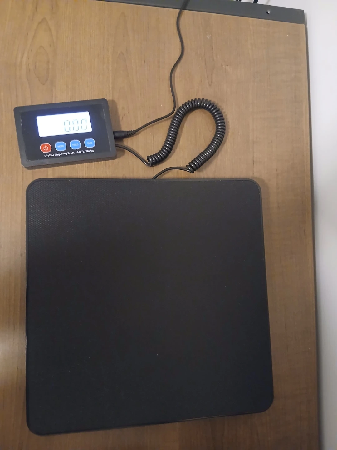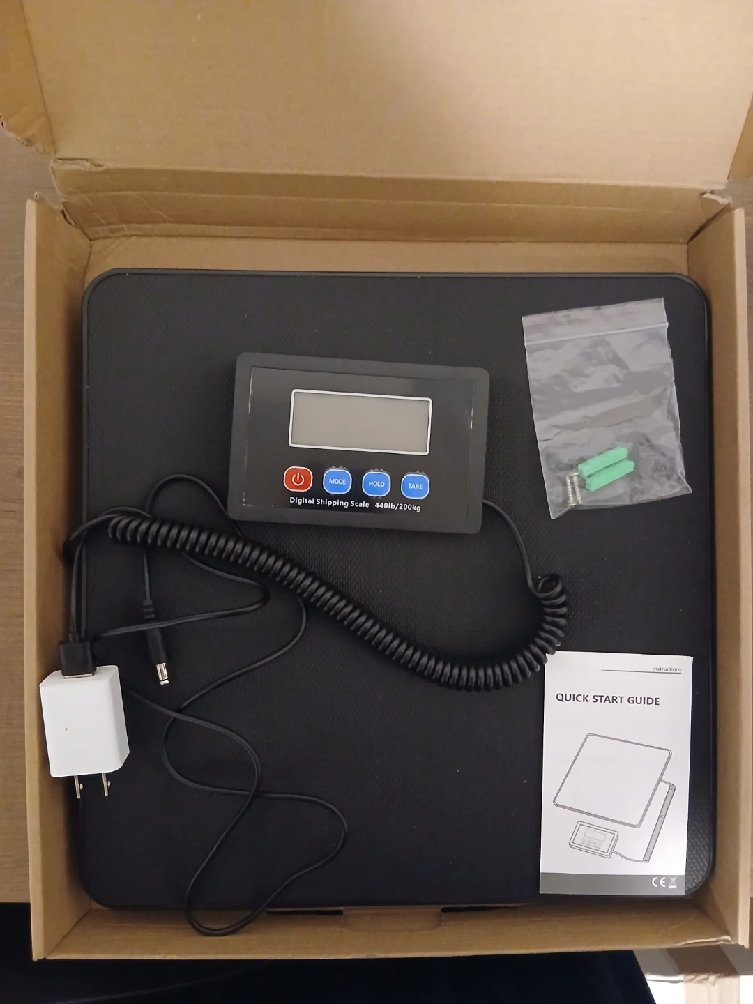 Digital shipping scale with a capacity of 440lb or 200kg. It's black and includes a power adapter and quick start guide. This scale is great for weighing packages for shipping.