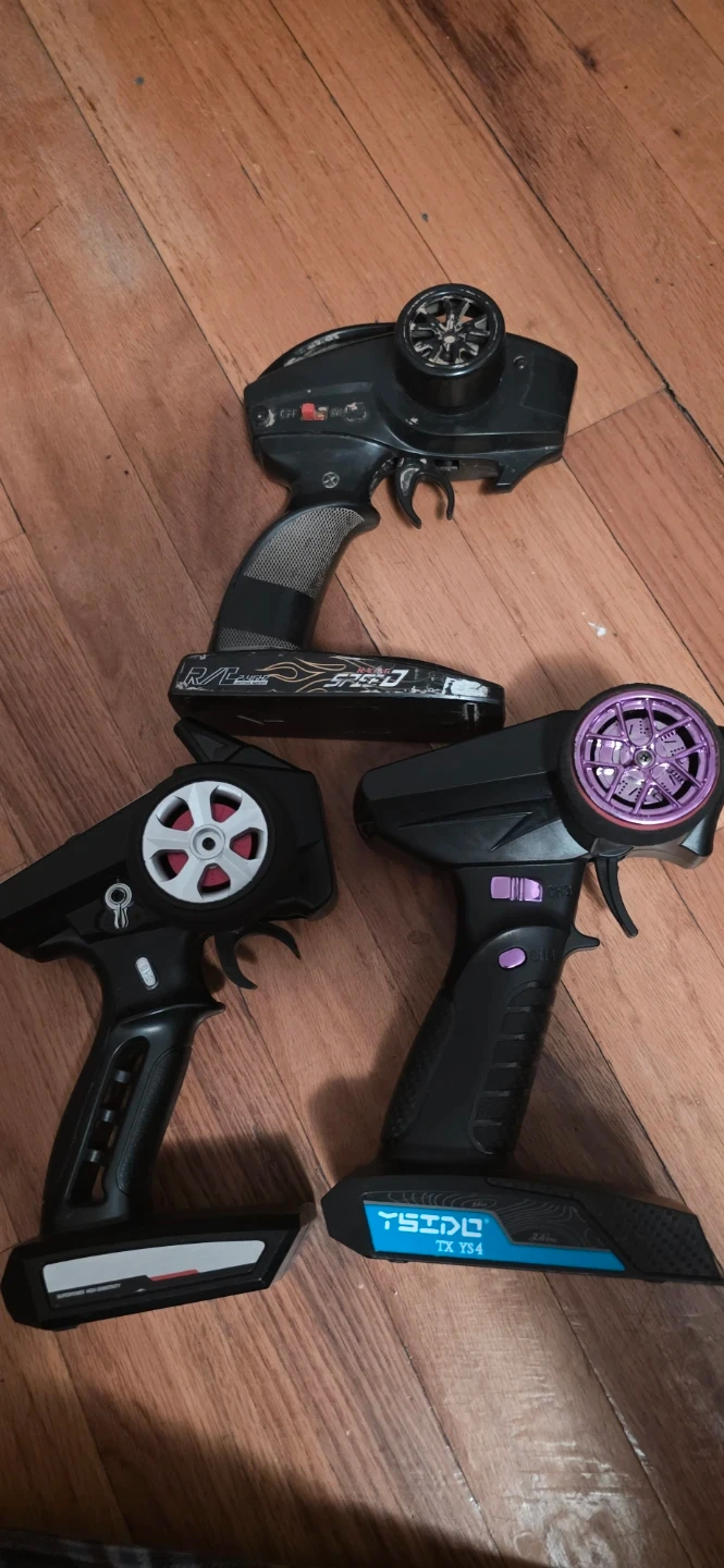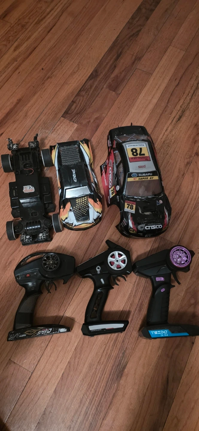 Includes three remote control car controllers and three car bodies. One body is a Subaru Super GT replica selling the lot for cheap for parts only you get everything for a low price