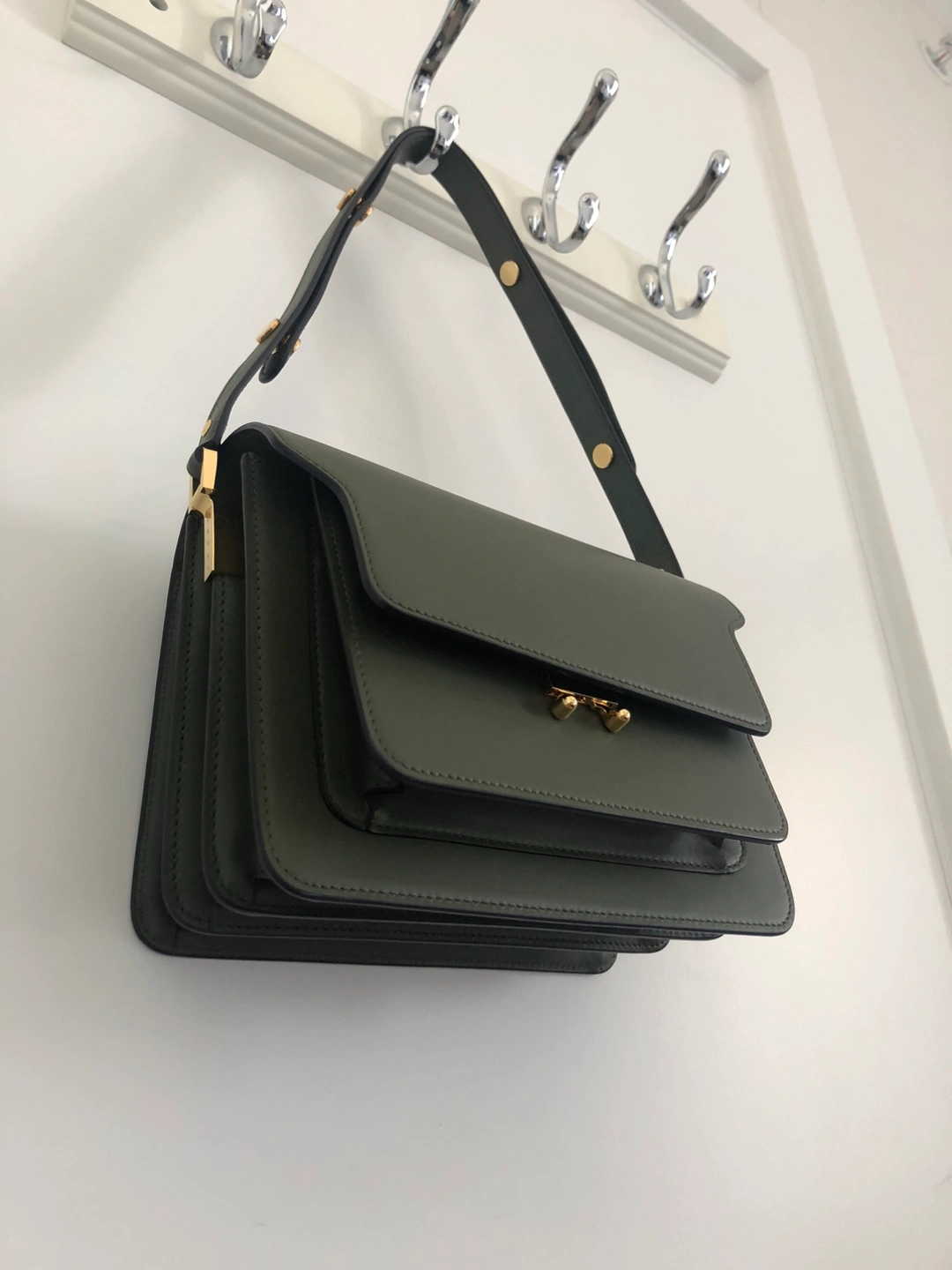 Pristine condition. Olive green shoulder bag. Adjustable shoulder strap. Interior with multiple compartments. It would be great for carrying all your essentials for any occasion.
